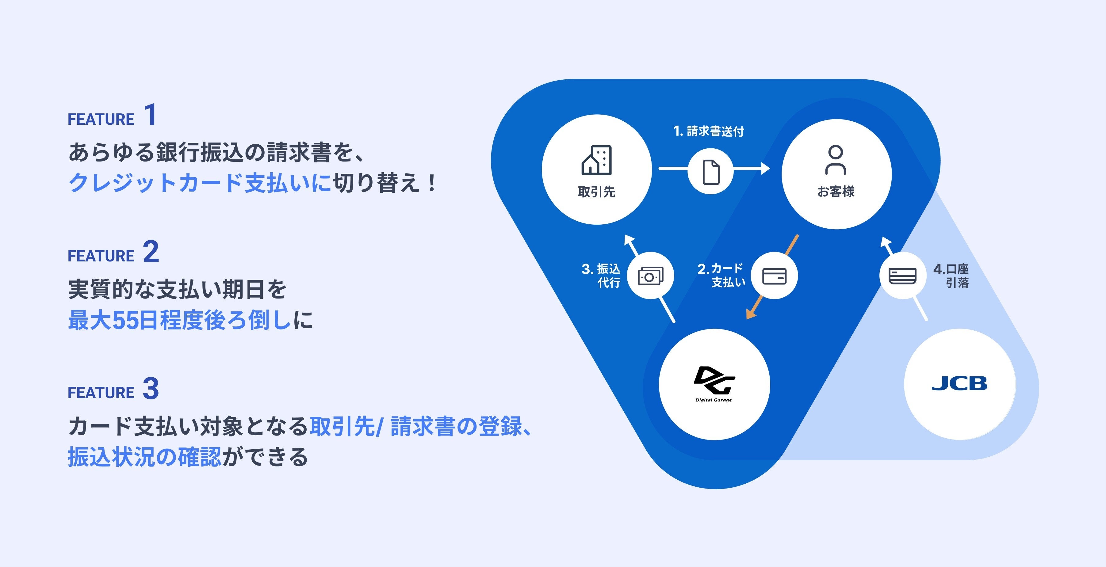 株式会社ジェーシービー (本社:東京都港区、代表取締役会長兼執行役員社長:浜川 一郎、以下:JCB)は、株式会社デジタルガレージ(本社:東京都渋谷区、代表取締役兼社長執行役員グループCEO:林 郁、以下:DG)は、銀行振込の請求書をクレジットカード払いに切り替えることで、実質的な支払い期日を繰延する「DGFT請求書カード払い」の提供を本日より開始します。