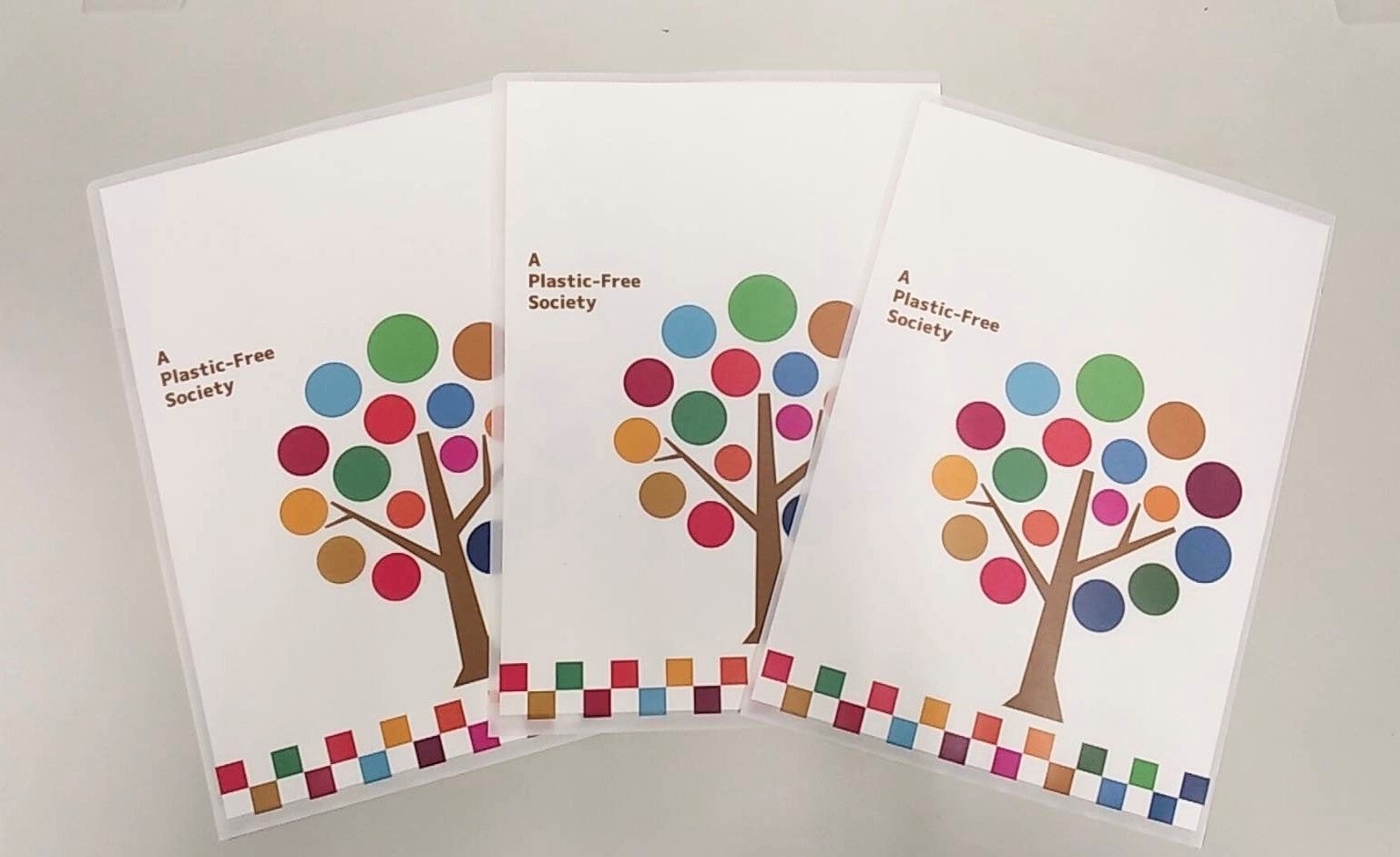【デザイン】環境との調和のシンボルとしての土と木を、SDGsの17の目標のカラーでデザインしました。そして、この紙製ファイルを使用することで脱プラスチック社会について考えてもらいたいという思いから、「A Plastic-Free Society」というメッセージを入れました。