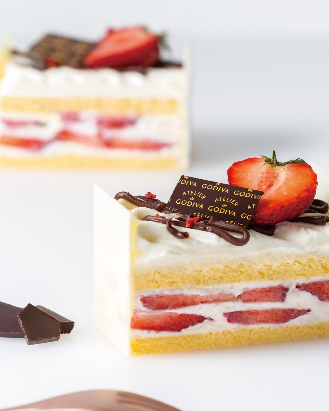 ショコラティエ自慢のストロベリーショートケーキです。ホイップクリームにホワイトチョコレートを混ぜ合わせ、スポンジの上にたっぷりと絞りました。上にはダークチョコレートガナッシュを合わせて濃厚でほろ苦いチョコレートの味わいをプラスしました。ATELIER de GODIVAが提案する、ショコラティエのショートケーキです。