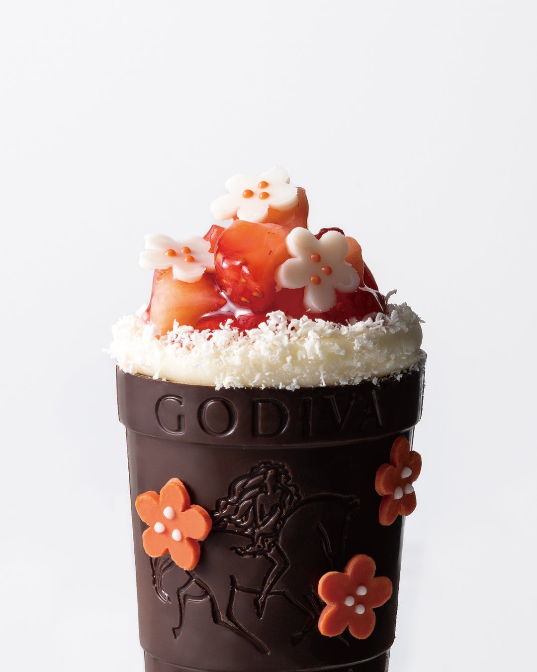 新年のお祝いにぴったりな、紅白のデコレーションをあしらったニューイヤー期間限定のクープショコラです。苺を贅沢に使用し、ダークチョコレートカップの中には、スポンジ、ホイッピングクリーム、ミックスベリーが層になっています。