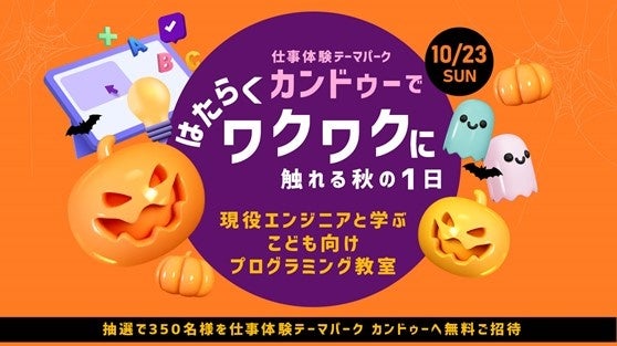 10月23日(日)、イオンモール幕張新都心にある仕事体験テーマパーク「カンドゥー」に抽選で350名を無料招待し、さまざまなお仕事体験の機会を提供いたします。また、ITエンジニア体験イベントとして、現役エンジニアによる子ども向けプログラミング教室「Try&Errorを楽しむ!プログラミングをやってみよう」も同日開催いたします。