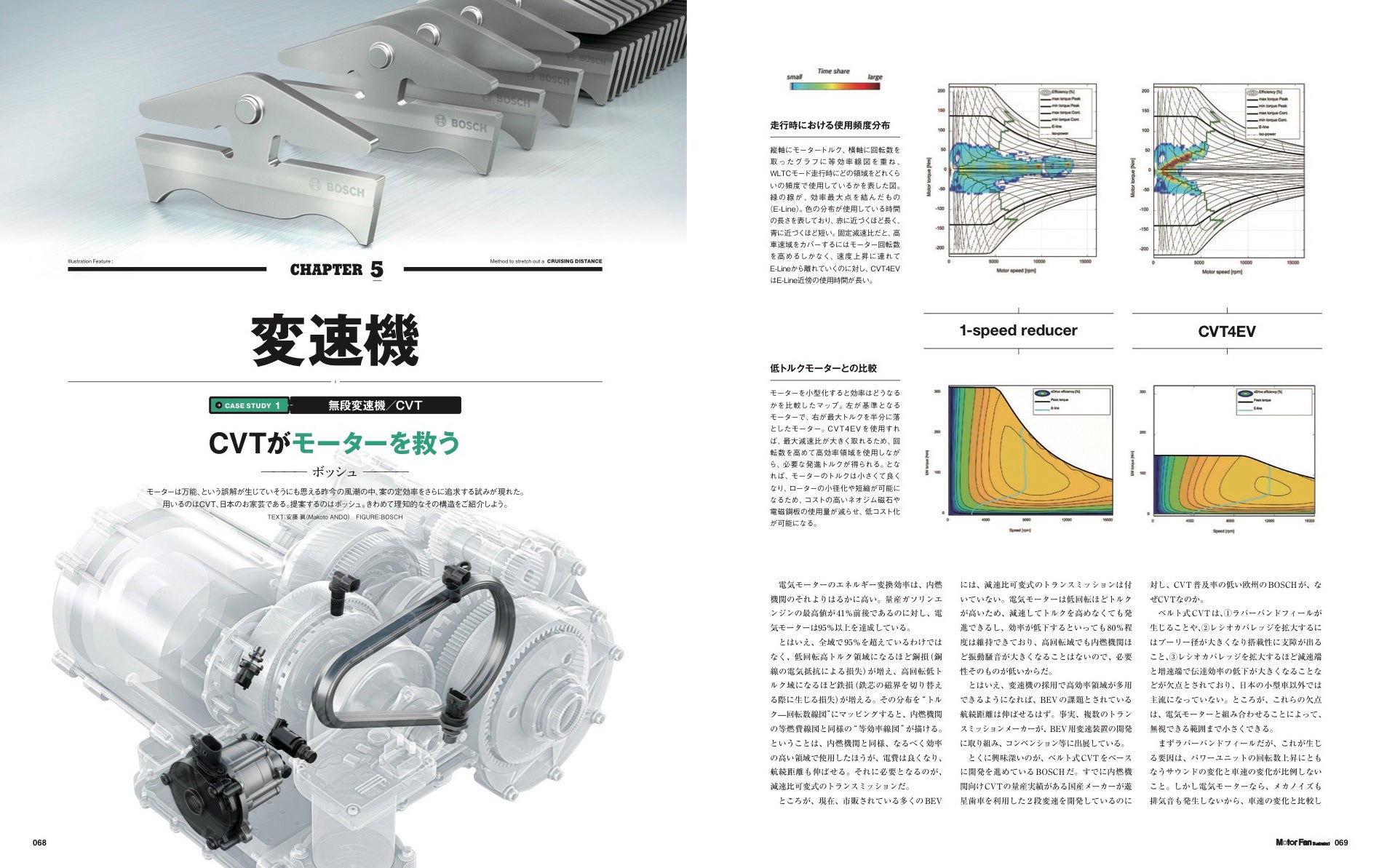 「変速機がないからシームレスな加速」などとよくつづられるモーター駆動の美点。回転開始直後に最大トルクを発揮する設計とされているのはよく知られるとおりですが、モーターは高回転が苦手。効率が悪くなり、結果航続距離に影響が現れます。高速域側に最適化すれば効率は向上しますが、今度は低速域側がよろしくなくなる。あちらを立てればこちらが立たず、なのです。これを両立させるのが変速機との組み合わせ。本章ではCVTとのコンビネーションの事例を紹介します。