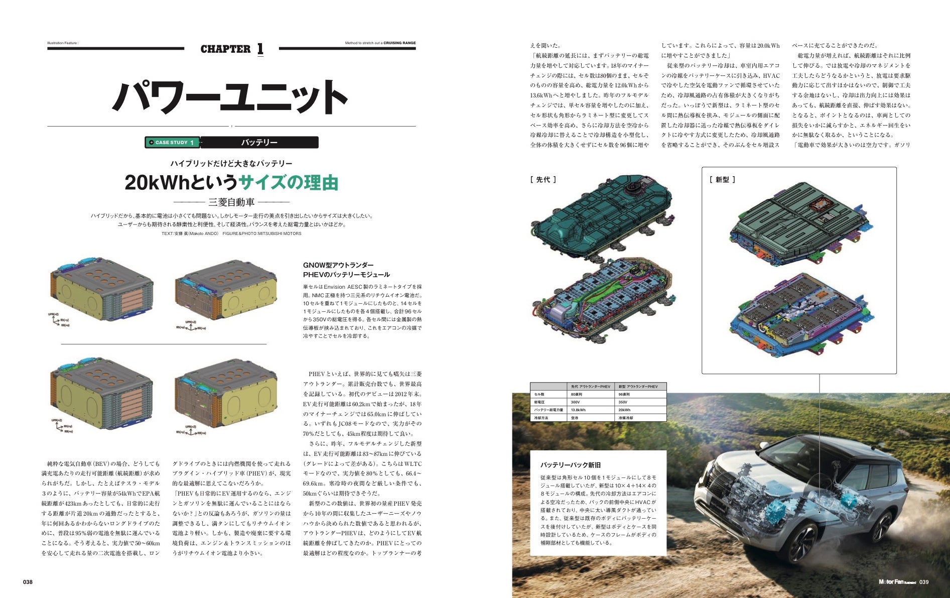 何よりまず思い浮かぶのはバッテリー。これを高効率で無理なく運用すればいかにも航続距離は伸びそうです。テーマとして取り上げたのはプラグインハイブリッドではあるものの大型バッテリーを載せ、モーター走行距離を追求したアウトランダーPHEV。トピックはパック内のバッテリーセルの冷却で、エアコンに用いる冷媒によって直接冷やす構造としています。