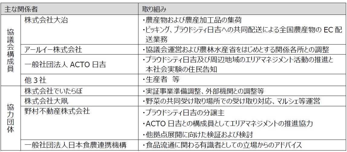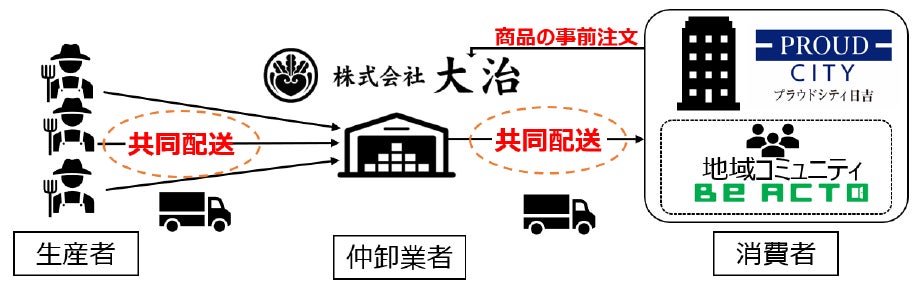 株式会社大治(本社:東京都大田区/代表取締役社長:本多諭、以下「大治」)、アールイー株式会社(本社:東京都豊島区/代表取締役:今井直樹)、一般社団法人ACTO日吉(拠点:神奈川県横浜市/代表理事:井上直樹、以下「ACTO日吉」)が主体となり、農林水産省の補助事業「物流生産性向上推進事業」を活用した実証に取り組むため、2024年6月に「スマートシティ型農産物共同配送実証プロジェクト」を組成し、協力団体の株式会社でいたらぼ(本社:東京都渋谷区/代表取締役:宮川博臣)、株式会社大凧(本社:福岡県宋像市/代表取締役:吉田啓助)、野村不動産株式会社(本社:東京都新宿区/代表取締役社長:松尾大作)と共に農林水産省の補助事業「物流生産性向上推進事業」を活用した実証事業に対し、プラウドシティ日吉にて開始したことをお知らせします。本取り組みは、全国の食材を業務用集荷便で大規模マンションに共同配送し、特定場所受取を活用して配送コスト(人的負担、再配達負担)の削減を目指す実証実験です。プラウドシティ日吉でのエリアマネジメント団体ACTO日吉の活動によって培われた地域コミュニティや活動の場をベースに、消費者が農産物を事前予約することにより余剰在庫がなくなり食品ロスの軽減や、共同受取場所への引取りによる個別配送の低減といった物流の課題解決に繋がる取り組みを行うことで、流通が限られている全国こだわりのご当地農産物の新しい調達手段にも繋げます。