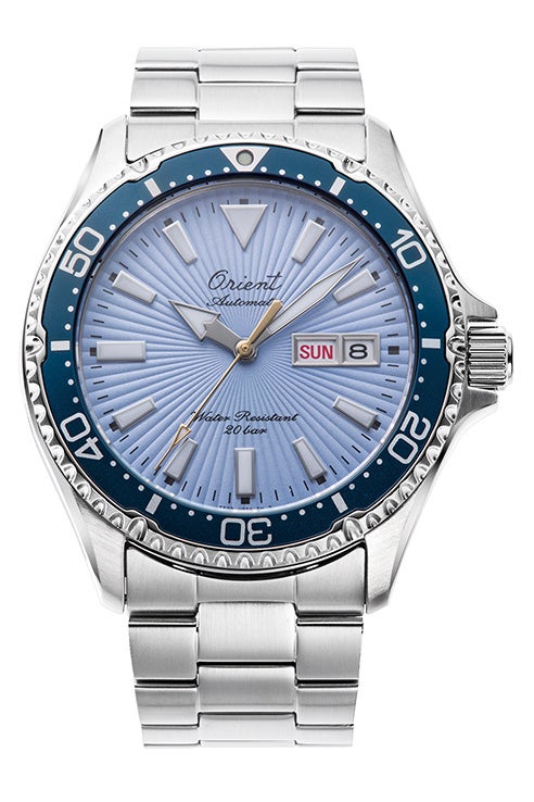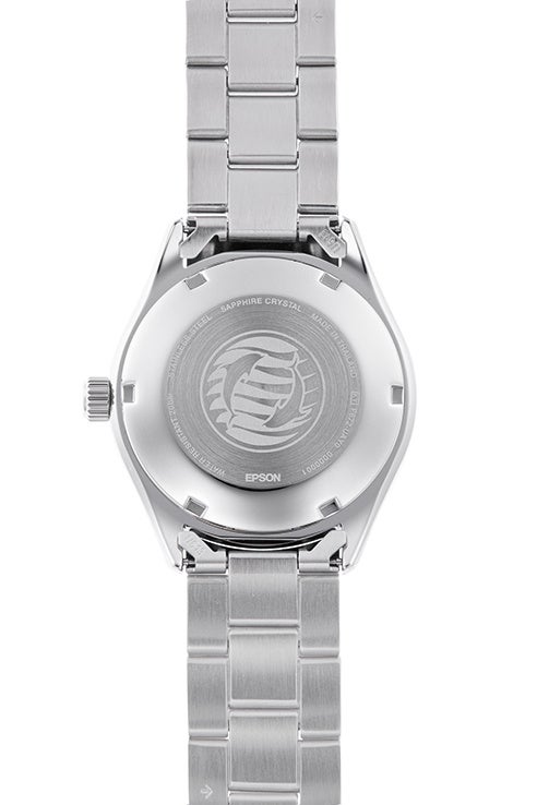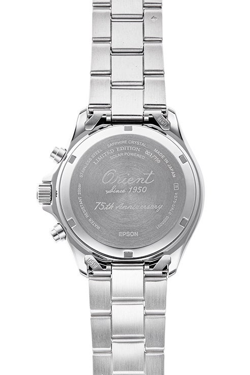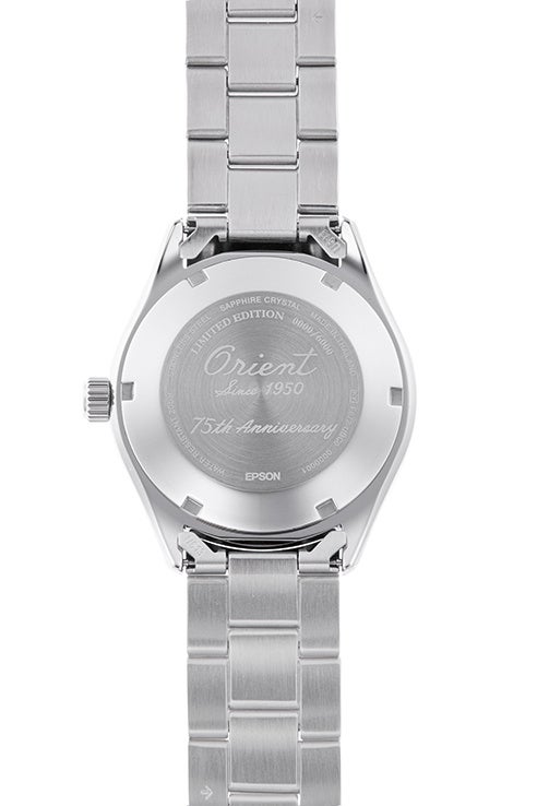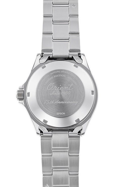 数量限定モデルのテーマは「青空と風を切るような爽快感」。アクティブなシーンに映えるスカイブルーの文字板、風を思わせる放射の型打ち模様、太陽光をイメージした秒針(クロノはクロノグラフ秒針)、そして1950 年代に用いられていた筆記体の旧オリエントロゴなどの共通仕様が特別感を強調しています。また、スクリューバックとねじ込み式りゅうずにより20 気圧の防水を確保したケースのうら蓋にも、筆記体による「Orient Since 1950 75th Anniversary」の文字と数量限定シリアル番号の刻印が記されています。