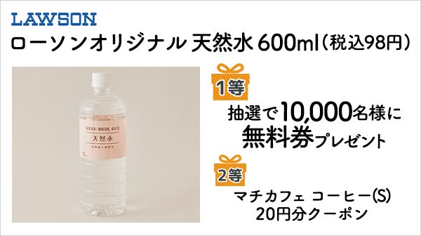 - 『ローソンオリジナル天然水 600ml(税込98円)』を10,000名様にプレゼント