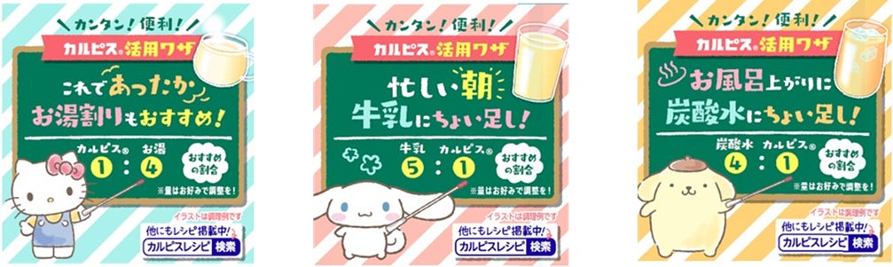 3アイテムに、「ハローキティ」、「ポムポムプリン」、「シナモロール」の3キャラクターをそれぞれ描いた9デザインを展開します。パッケージ正面には、キャラクターが「カルピス」を「作る」・「飲む」・「楽しむ」様子を描いています。同じ商品で3種類を集めても、好きなキャラクターで3種類を集めてもストーリーがつながります。裏面には、キャラクターが「カルピス」の飲み方や飲むシーンなどを伝える活用ワザを掲載し、飲用シーンの拡大を目指します。