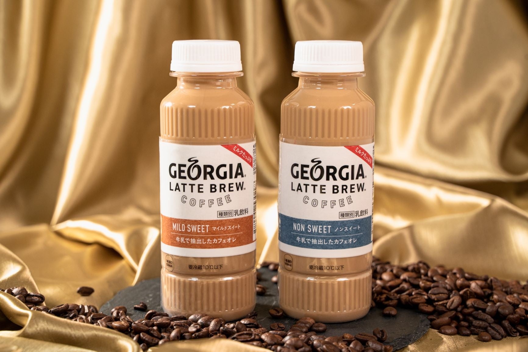 市場では、コーヒー専門店がSNSで人気を集めるなど、本格的な味わいが求められていることから、このたび、ジョージア史上初のチルドPETボトル飲料「ジョージア ラテブリューコーヒー(ノンスイート)」「ジョージア ラテブリューコーヒー(マイルドスイート)」の2種類をファミリーマート限定で発売いたします。「ジョージア ラテブリューコーヒー」は、深煎り豆をミルクで抽出したひと手間かけた製造方法で、コーヒー専門店のようなおいしさをお楽しみいただけます。