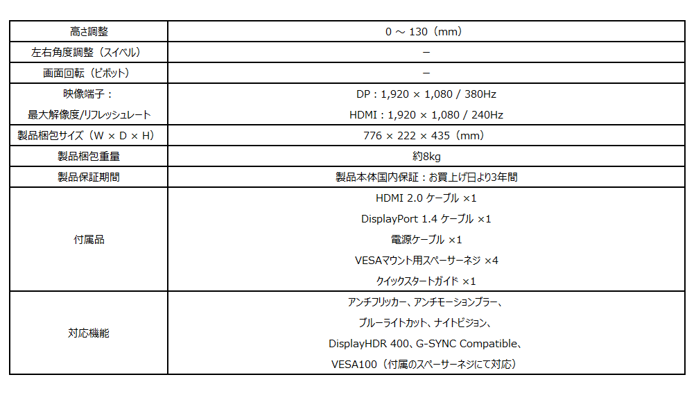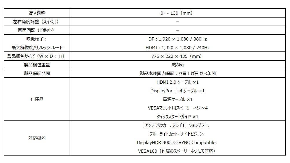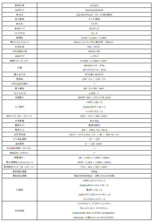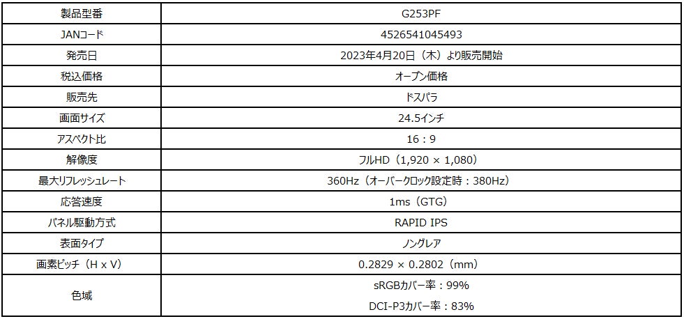 驚異的な380Hz駆動で圧倒的なゲーミング性能を実現 応答速度1ms(GTG)・高画質RAPID IPSパネル搭載 ドスパラ専売モデル「G253PF」発売