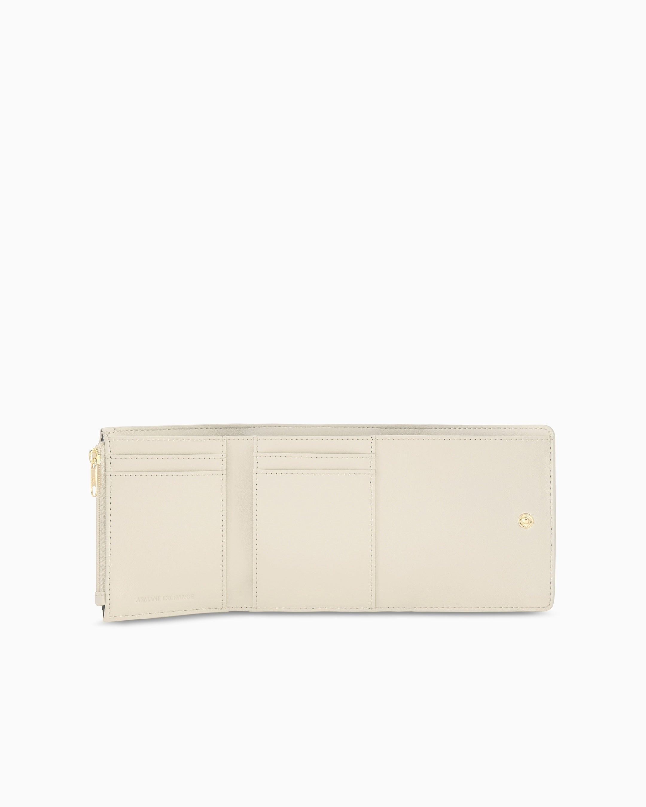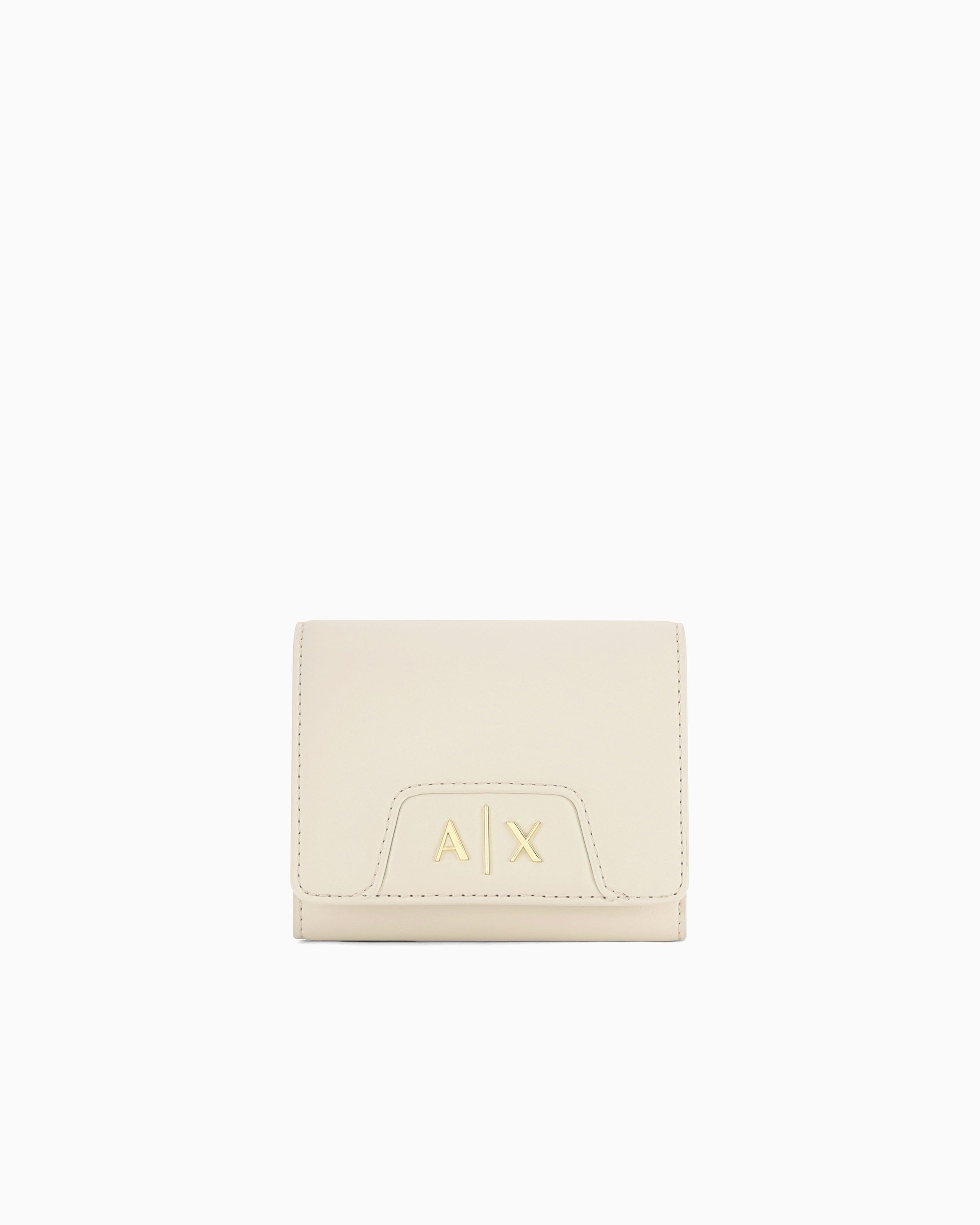 ウィメンズからは、フロントに配したAXロゴがアクセントになった、ミニマルでモダンな三つ折りミニウォレット。コンパクトなサイズながら、幅広の紙幣コンパートメント、4つのカードスロット、コインパースを備えた実用的なデザインです。