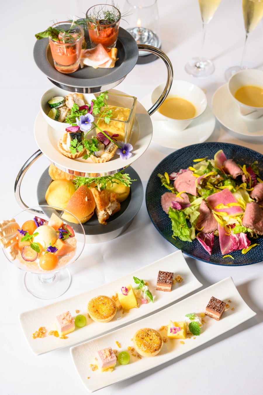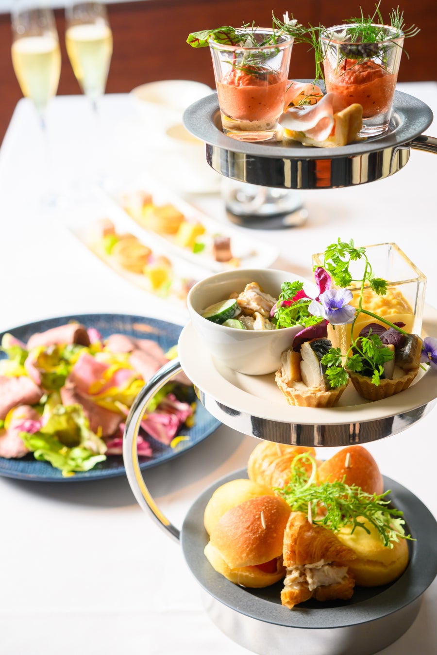 その他、季節のポタージュ、デザートプレート、乾杯のスパークリングワインが付く、贅沢なハイティーセットです。