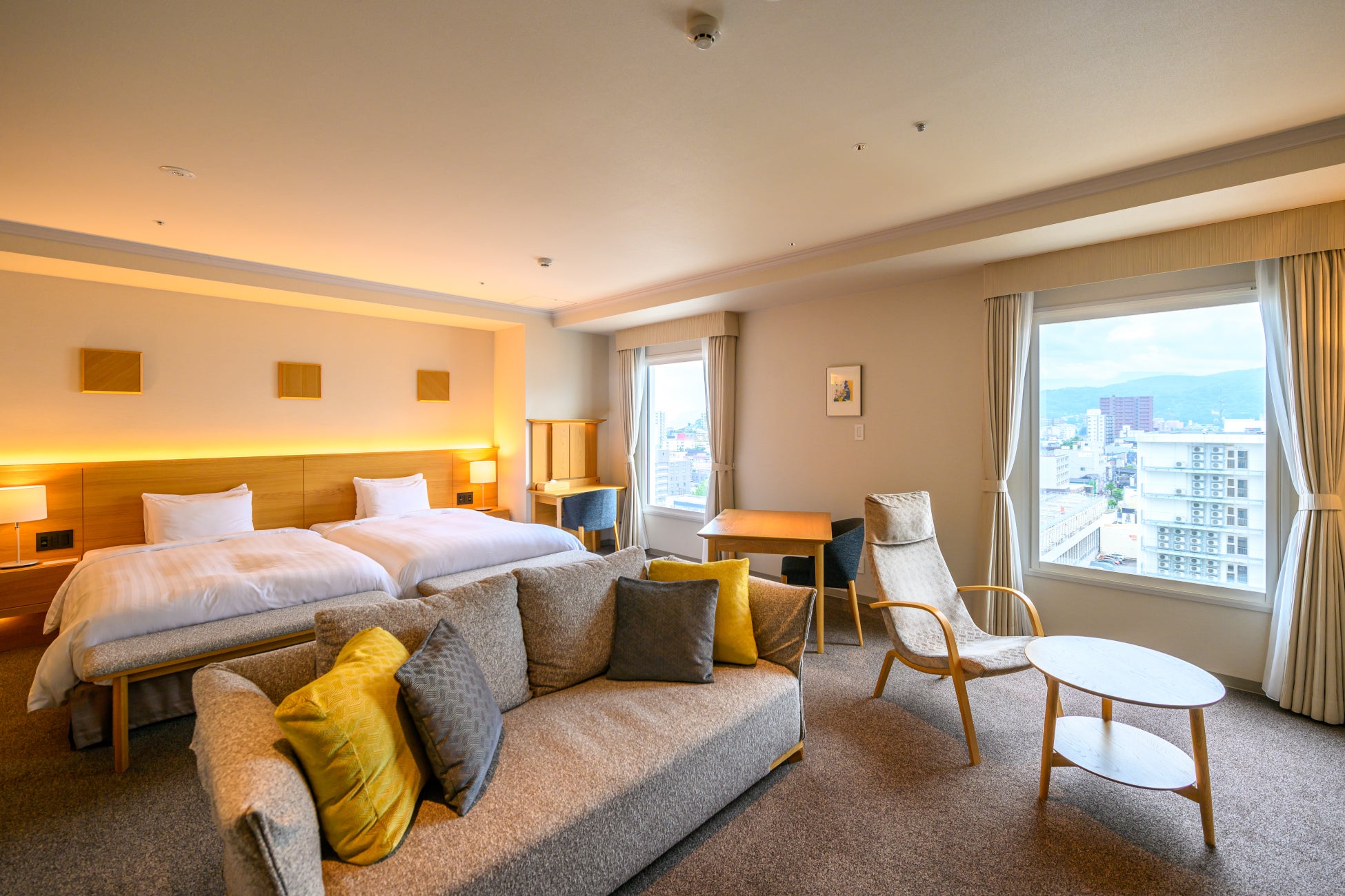 北の大地で成長した北海道産木材を活用しました。シンプルなデザインの中にあたたかみのある客室で開放的な滞在をどうぞ。ホテルパティシエメイドの焼き菓子や、北海道生ワインや地ビールなどをお楽しみいただける「サロンクラスラウンジ」でもごゆっくりお寛ぎください。