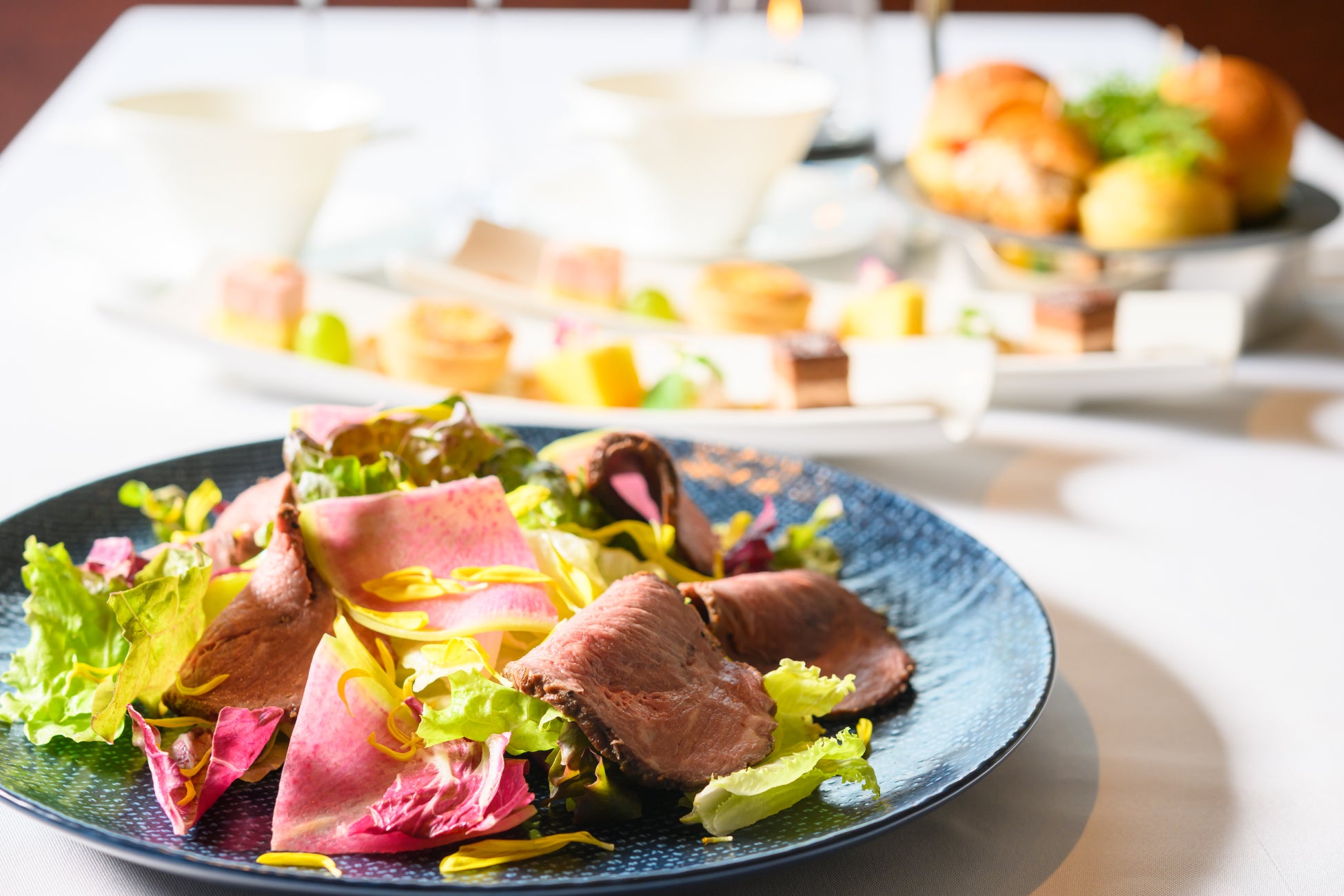 ローストビーフをしっとりと調理し、ピリリと香るブラックペッパーで大人の雰囲気に。彩り野菜のサラダと調和のとれた一皿です。