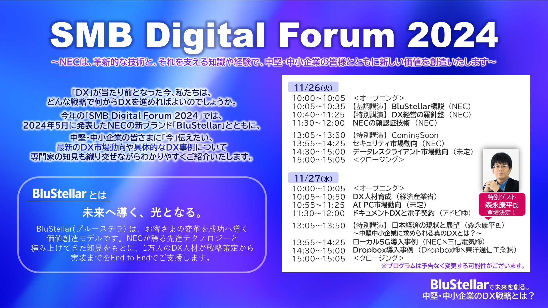 本イベントでは、2024年5月に発表したNECの新ブランド「BluStellar」とともに、中堅・中小企業の皆さまに「今」伝えたい、最新のDX市場動向や具体的なDX推進事例について専門家の知見も織り交ぜながらわかりやすく解説いたします。