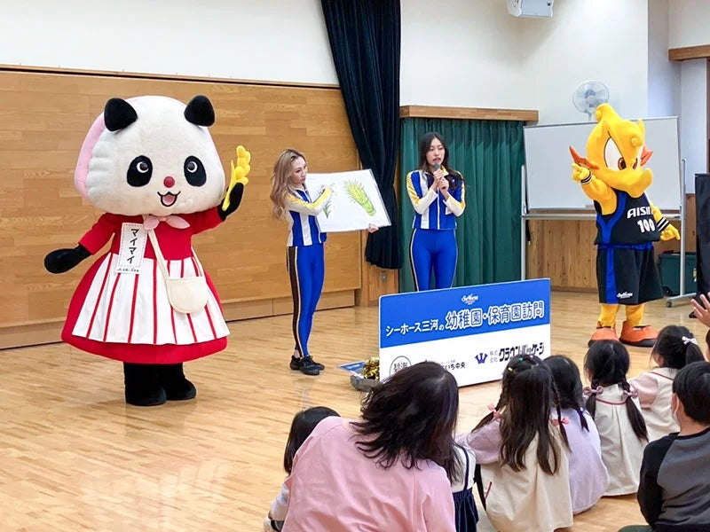 2025年1月23日(木)、シーホースくんとSuper GirlsのCHISAKI、SAHOが和泉保育園(安城市)を訪問し、園児の皆さんと一緒にクイズやダンスを楽しみました。今回はJAあいち中央のマイマイも訪問し、参加してくれた園児へお米を一緒にプレゼントしました。