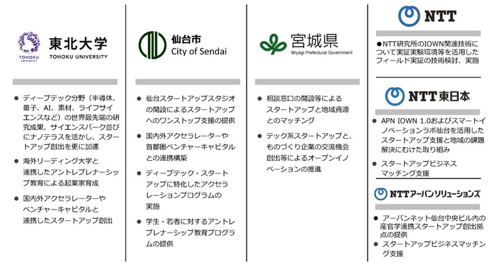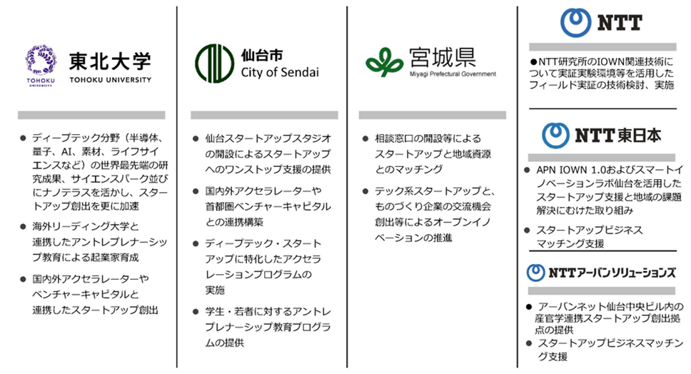 NTT東日本は地域社会の発展への寄与を目指し、「スマートイノベーションラボ 仙台(*1)」を地域共創拠点として、これまでも地域におけるスタートアップ関連事業への参画などのスタートアップ支援を推進して参りました。この度、新たに本協定に参画することで、NTTグループの地域フロントとして関係機関と連携し、より一層の地域経済発展に寄与することを目的とするものです。