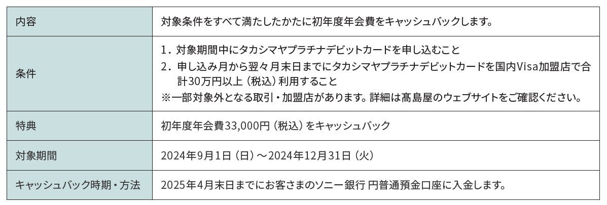 ソニー銀行株式会社(代表取締役社長:南 啓二/本社:東京都千代田区/以下 ソニー銀行)は、株式会社髙島屋(代表取締役社長:村田 善郎/本社:大阪市中央区/以下 髙島屋)と「タカシマヤプラチナデビットカード初年度年会費33,000円キャッシュバックキャンペーン」を2024年9月1日(日)より開始しましたのでお知らせします。