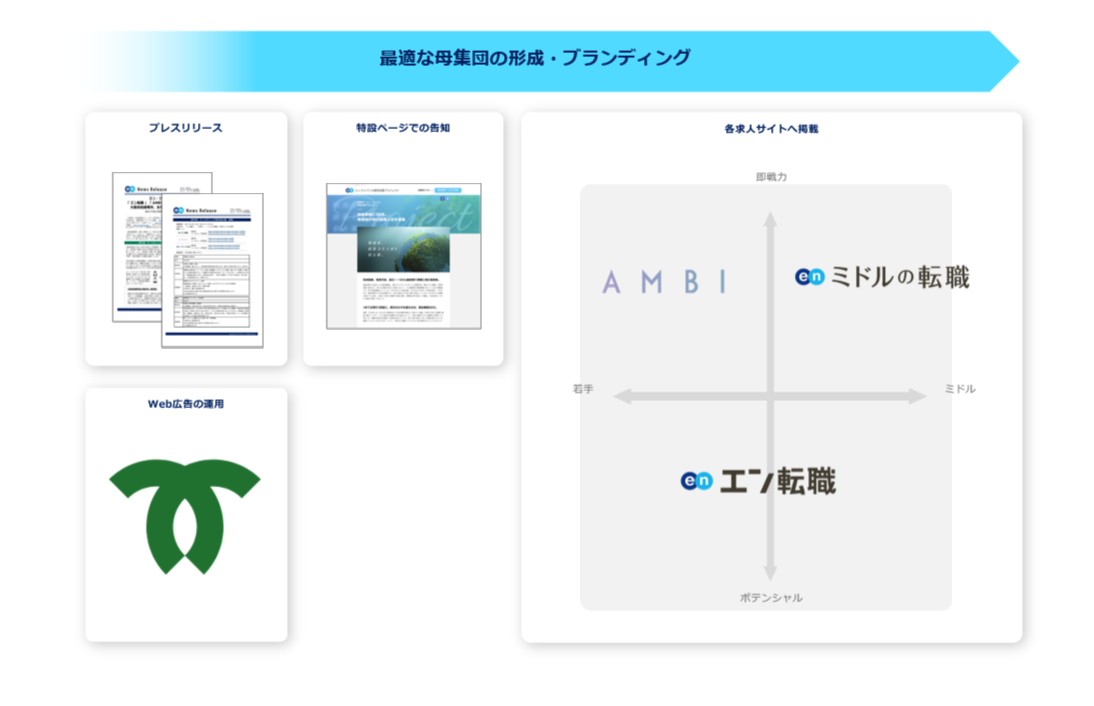 プレスリリースや特設ページ、Web広告での告知に加え、各求人サイトでの集客サポートを実施。『エン転職』『AMBI』『ミドルの転職』とターゲットの異なる3つの求人サイトを活用することで、ターゲットへ網羅的に求人を届けました。
