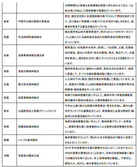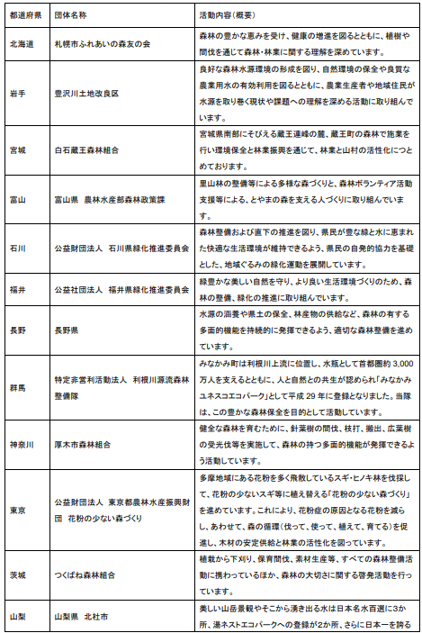 都道府県 団体名称 活動内容(概要) 北海道 札幌市ふれあいの森友の会 森林の豊かな恵みを受け、健康の増進を図るとともに、植樹や 間伐を通じて森林・林業に関する理解を深めています。 岩手 豊沢川土地改良区 良好な森林水源環境の形成を図り、自然環境の保全や良質な 農業用水の有効利用を図るとともに、農業生産者や地域住民が 水源を取り巻く現状や課題への理解を深める活動に取り組んで います。 宮城 白石蔵王森林組合 宮城県南部にそびえる蔵王連峰の麓、蔵王町の森林で施業を 行い環境保全と林業振興を通じて、林業と山村の活性化につと めております。