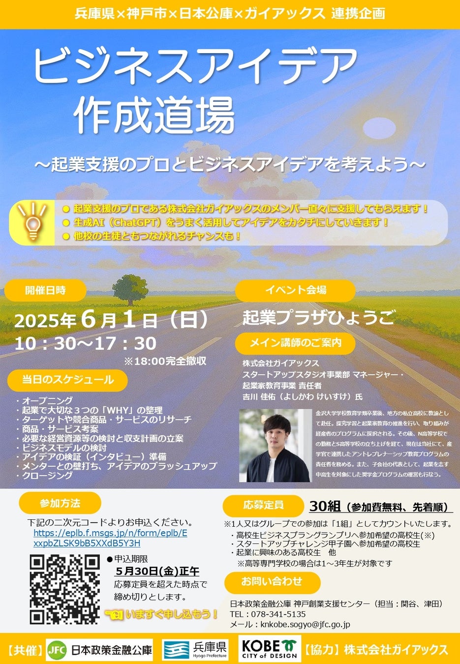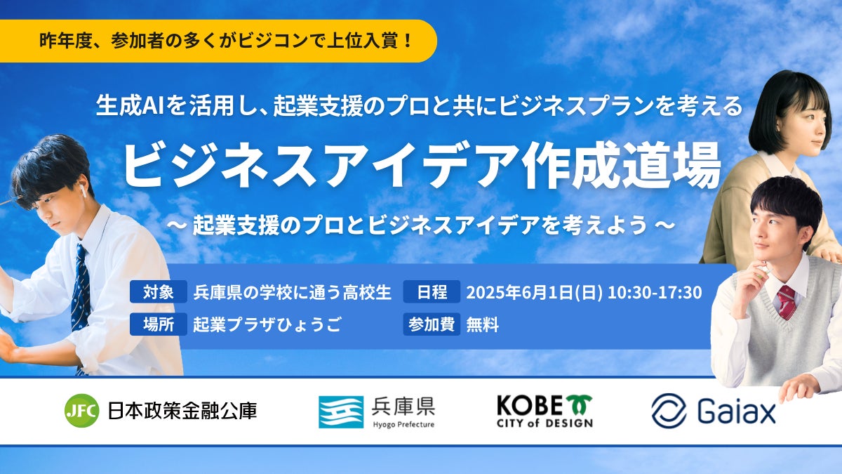 中高生向けのアントレプレナーシップ教育プログラム「起業ゼミ」を運営する株式会社ガイアックス(本社:東京都千代田区、代表執行役社長:上田 祐司、証券コード:3775、以下「ガイアックス」)は、兵庫県の「若年層向けアントレプレナーシップ教育プログラム導入事業」業務を受託し、日本政策金融公庫・兵庫県・神戸市と連携して、1dayの起業アイデア考案プログラム「ビジネスアイデア作成道場 ~起業支援のプロとビジネスアイデアを考えよう~」を実施します。