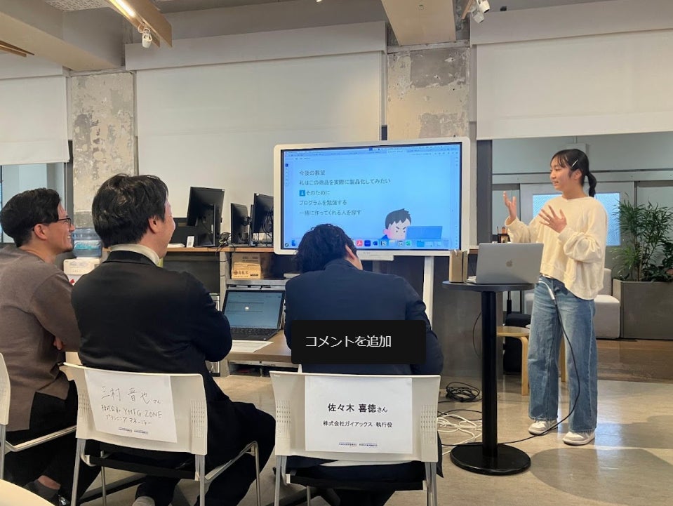 ・起業の過程の型を知ることができて良かった。また、丁寧に案を評価してくださり、自分のためだけのコメントがいただけ、とても貴重で、重要な時間だと感じました。