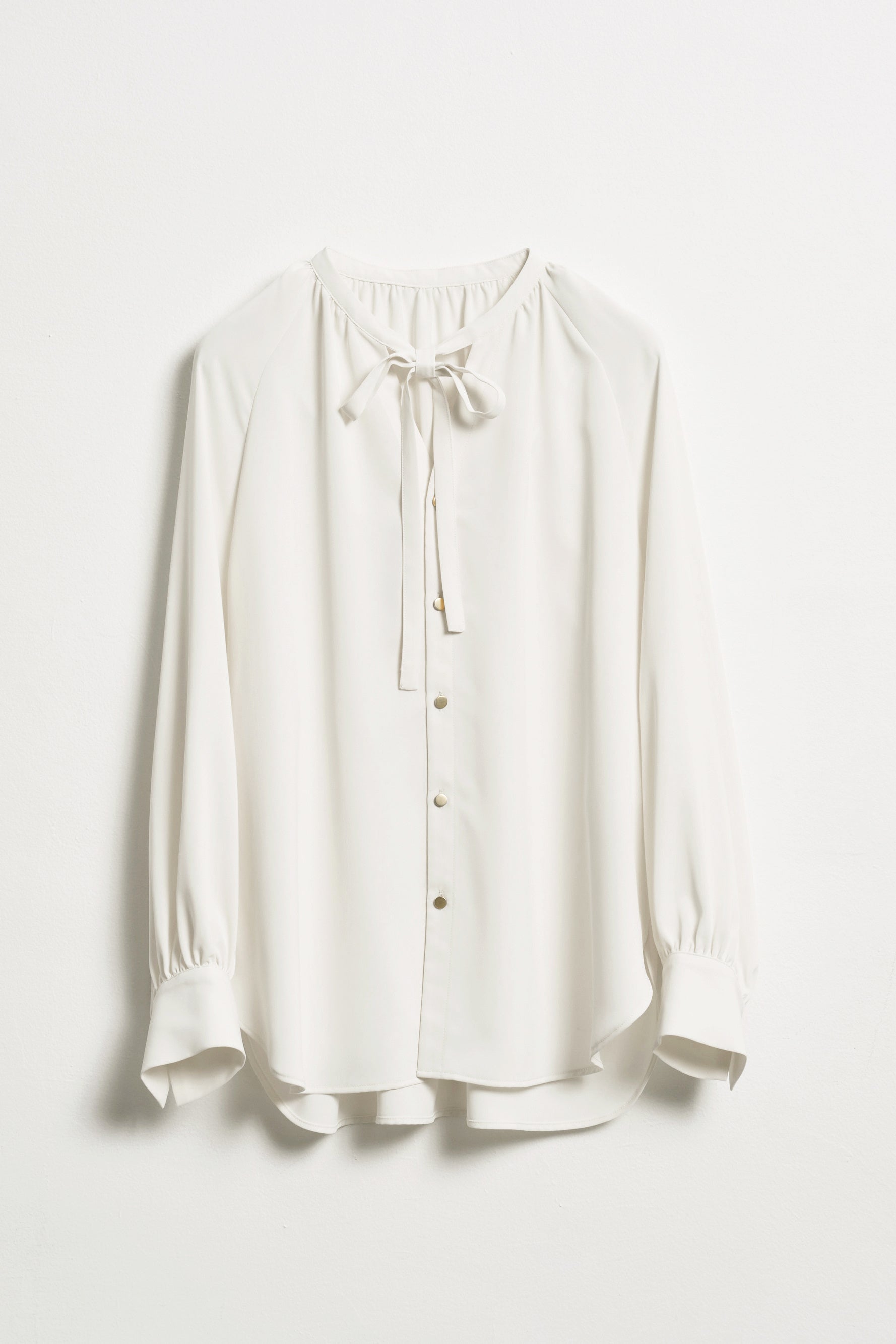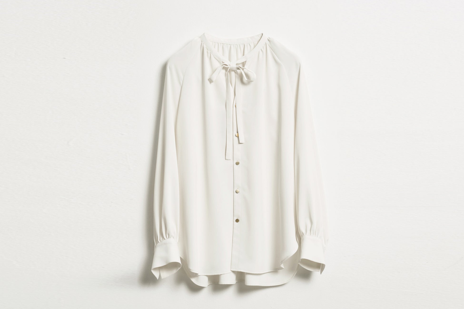 結んだり、垂らしたり、タイの使い方によって表情が変わるデザインブラウス。