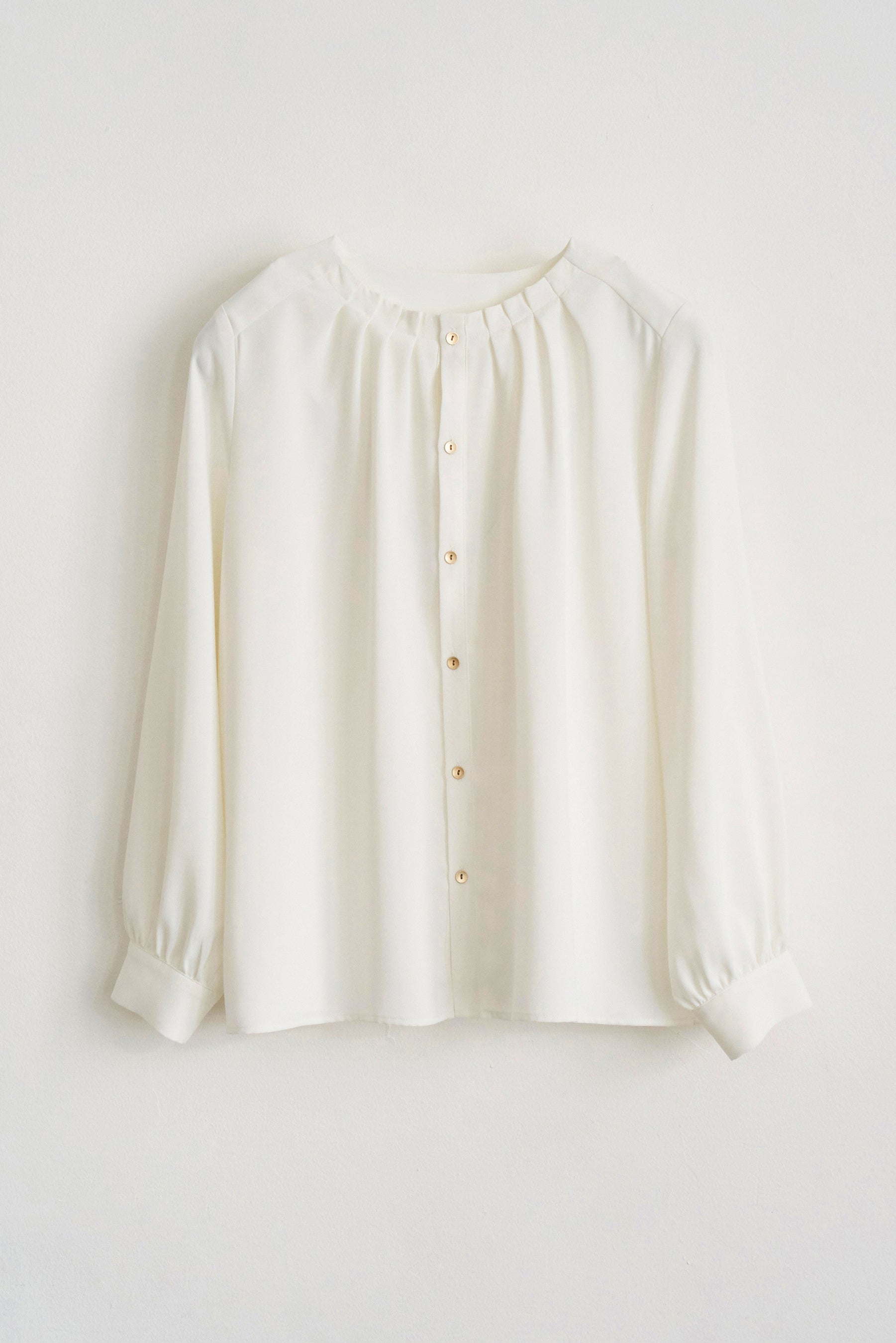 前開きでも使える金釦ブラウスは、首元のタックデザインで1枚でも華やかに決まる。