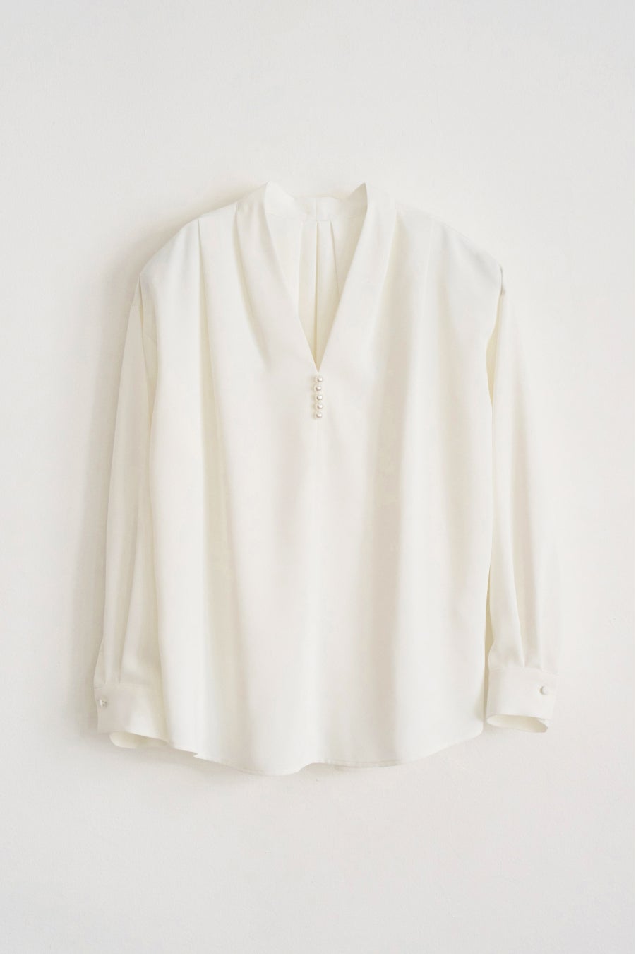 Vネックで首元スッキリ&フロントのパールが上品なフェミニンブラウス。