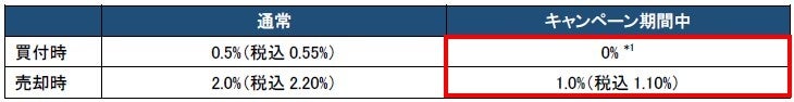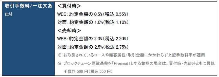 *1 ブロックチェーン原簿基盤を「Progmat」とする銘柄の場合には買付時・売却時ともに最低手数料が500円(税込550円)かかりますが、キャンペーン期間中の買付時には最低手数料は適用されません。