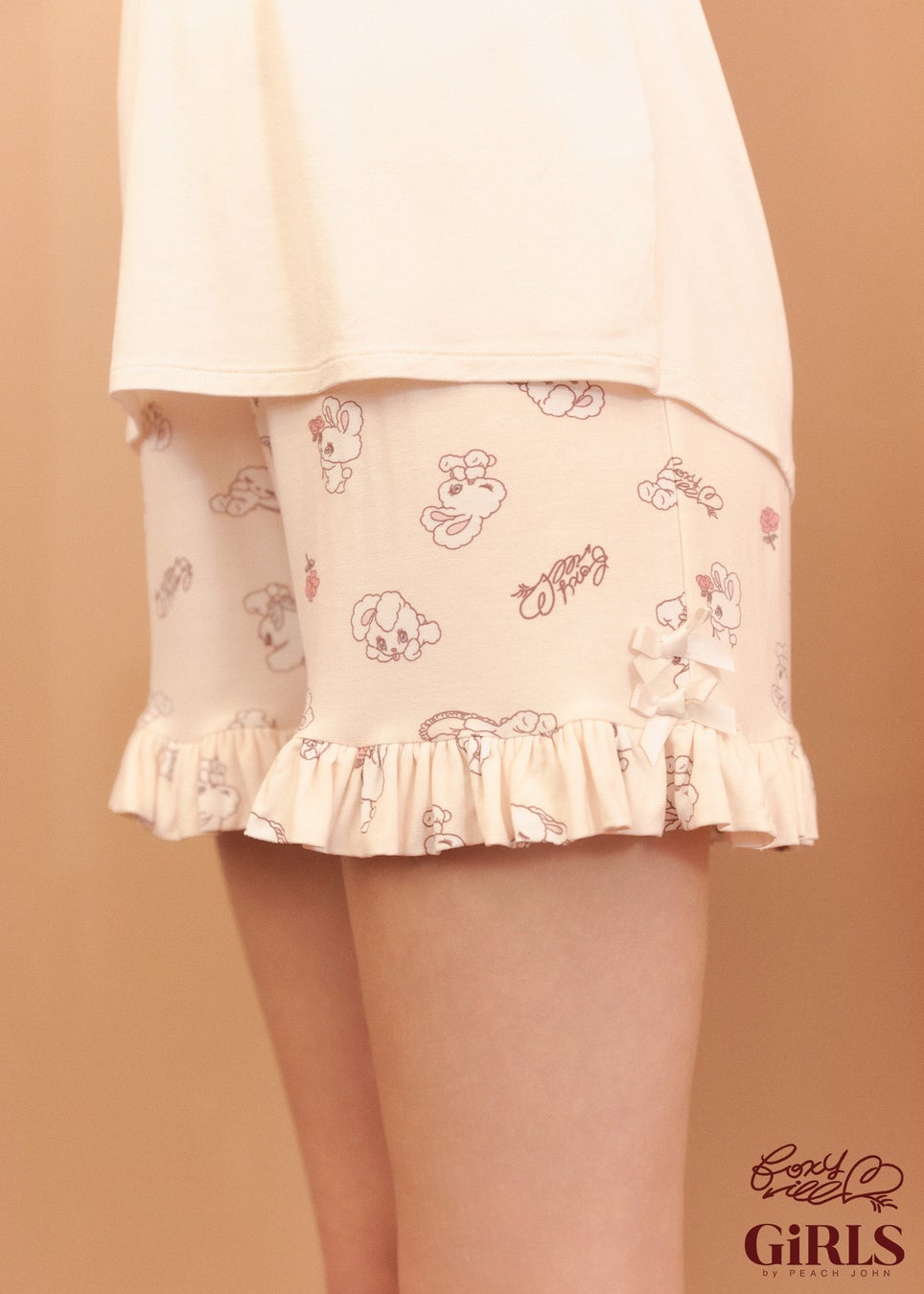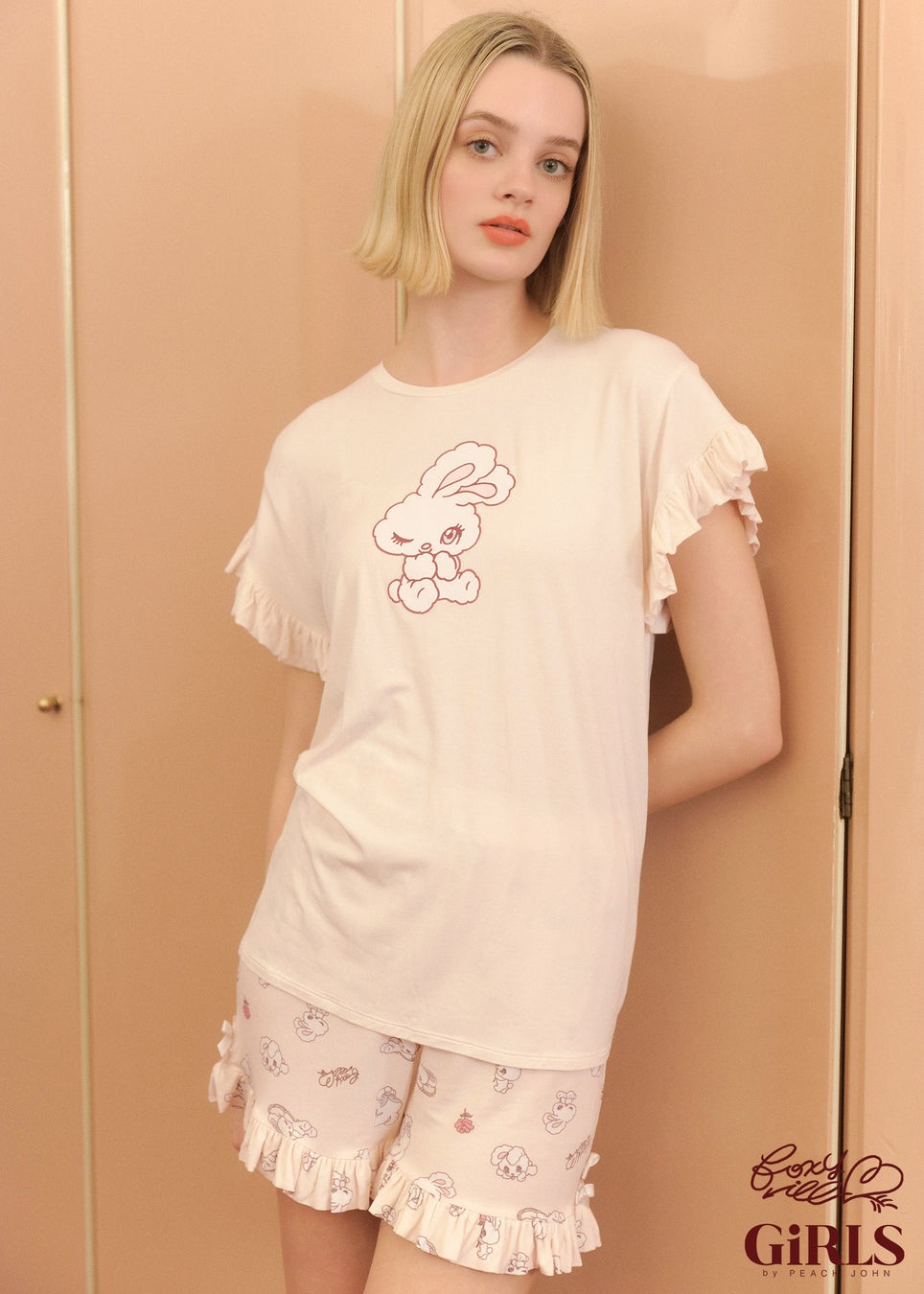 foxy illustrationsが描き下ろしたオリジナルのBunnyやGirlが大きくプリントされたフリルパジャマ。