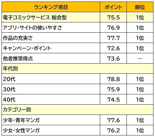 この度、『2025年 オリコン顧客満足度ランキング』の「電子コミックサービス 総合型」において、調査対象企業33社のうち、昨年に引き続き2年連続、通算3回目※(※2021年、2024年、2025年)となる総合第1位を獲得しました。また、評価項目別ランキングの「アプリ・サイトの使いやすさ」「作品の充実さ」「キャンペーン・ポイント」で第1位、さらにユーザーの年代別では「20代」「30代」「40代」で第1位、カテゴリー別において「少年・青年マンガ」「少女・女性マンガ」で第1位と、すべてのランキング項目にて第1位となり、幅広い年代から高い評価をいただき、今回の結果となりました。
