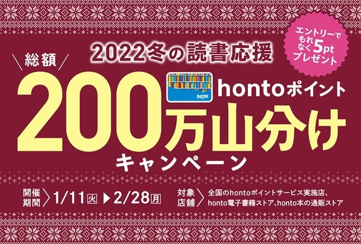 大日本印刷株式会社(DNP)が株式会社丸善ジュンク堂書店、株式会社文教堂及び株式会社トゥ・ディファクトと共同で運営するハイブリッド型総合書店「honto(https://honto.jp/)」は、「2022冬の読書応援 200万ポイント山分けキャンペーン」を2022年1月11日(火)から2022年2月28日(月)までの期間、丸善、ジュンク堂書店、文教堂、啓林堂書店などのhontoポイントサービス実施店とhonto電子書籍ストア、honto本の通販ストアで実施します。