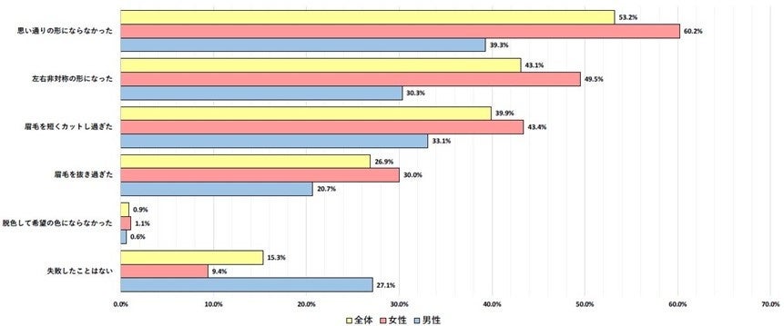 - Q. 自宅で(自分で)手入れしている」と回答した方にお聞きします。眉の手入れで失敗をしたことがありますか?失敗したことがある方は、どのような失敗をしましたか?あてはまるものをすべてお答えください。(複数回答/n=3124)