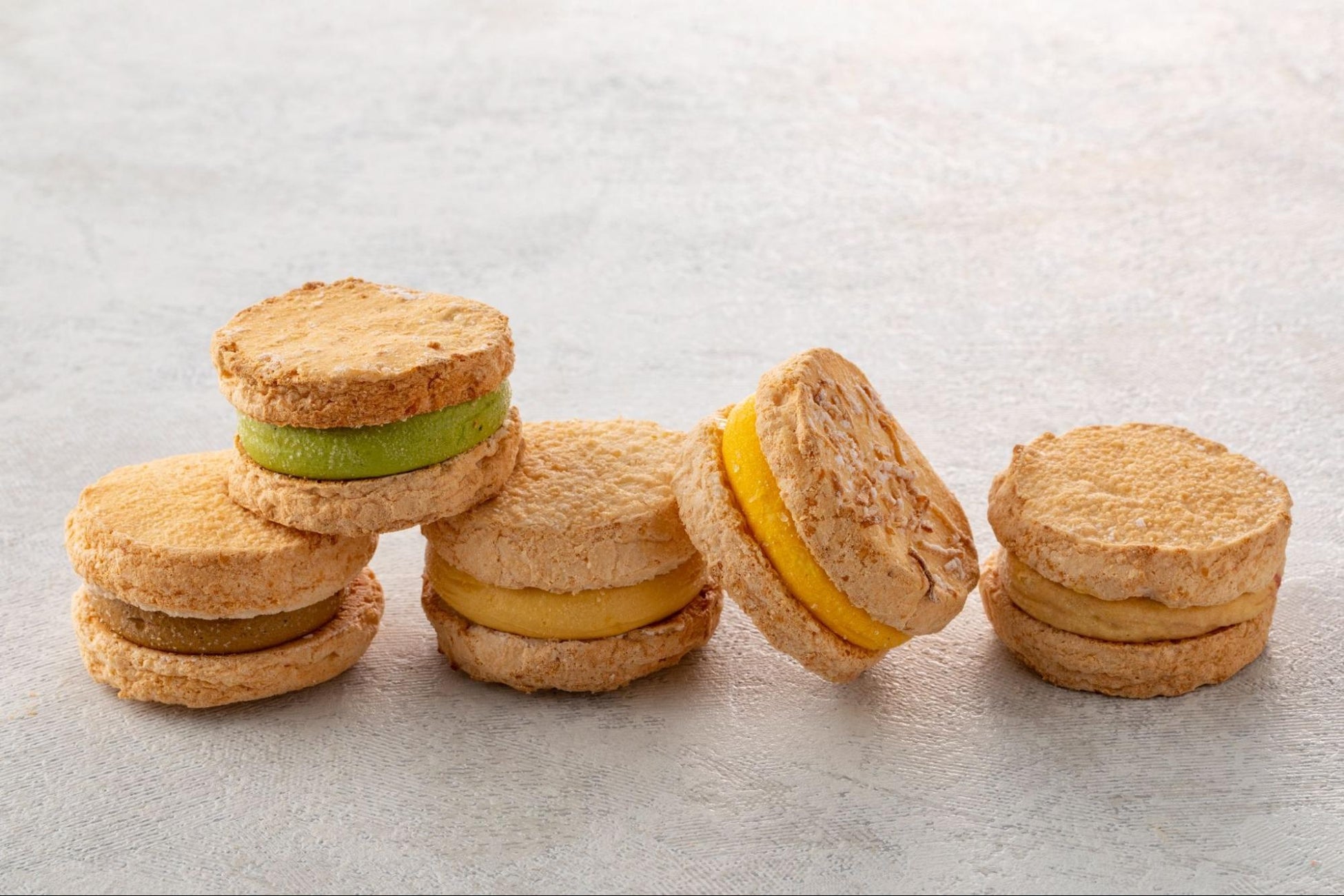 商品特長 :サクサク、ふわふわ、クールな新食感。人気のダックワーズ生地にアイスをサンドしました。 キャラメル・カフェ・ストロベリー・マンゴー・抹茶×各種1個ずつの計5個入。