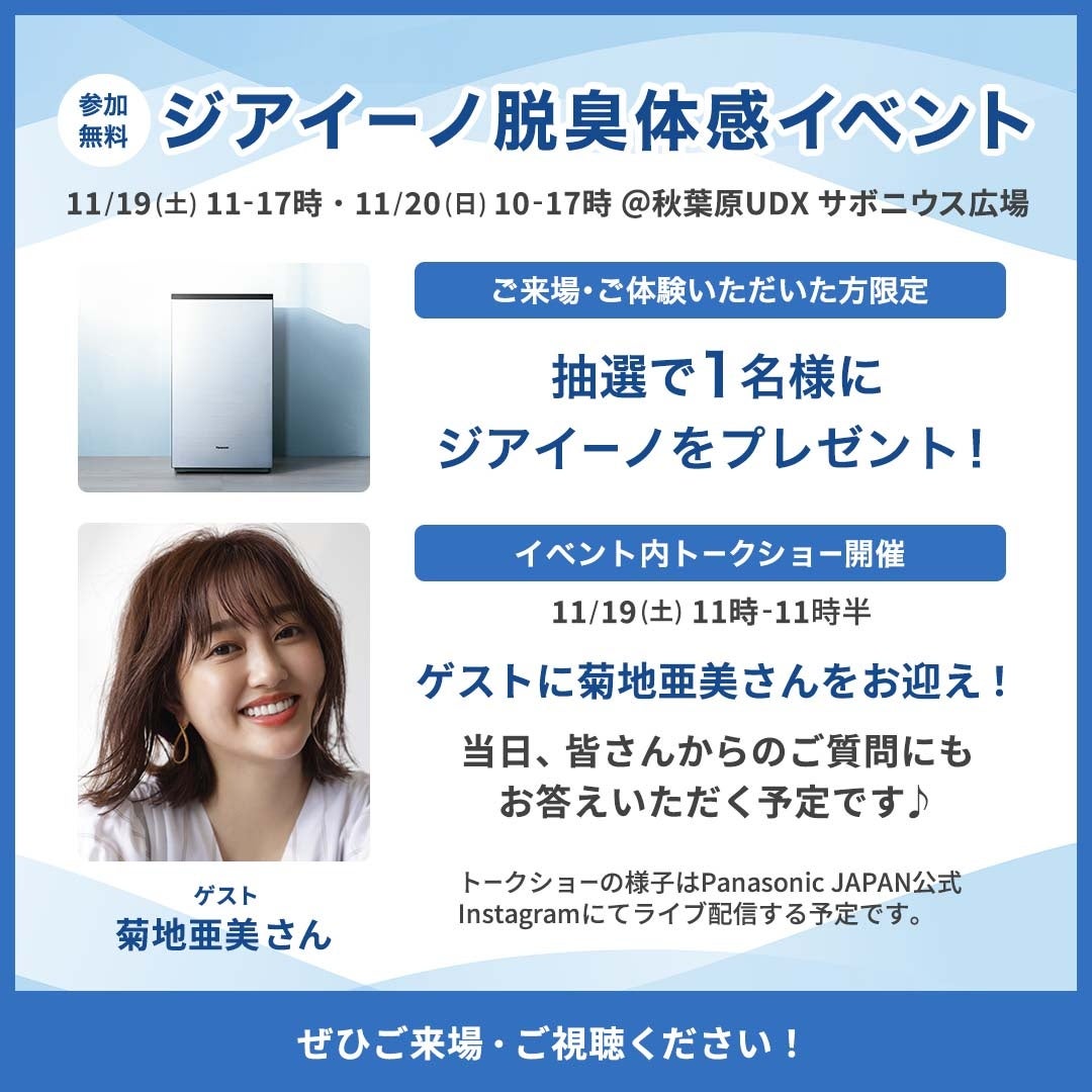 また、初日(11/19)11時から、会場にタレントの菊地亜美さんをお招きし、トークショーを実施します。トークショーでは、ご自宅で実際に「ジアイーノ」を使われたときの感想や夫婦&子育て秘話をお話し頂き、そして会場に設置している「ジアイーノ脱臭体感Room」の体験など、盛り沢山の内容でお届けします。さらに菊地さんには、当日会場にお越し頂いた方からのご質問にも回答いただく予定です。なお、トークショーの様子はパナソニック公式Instagramからもライブ配信します。