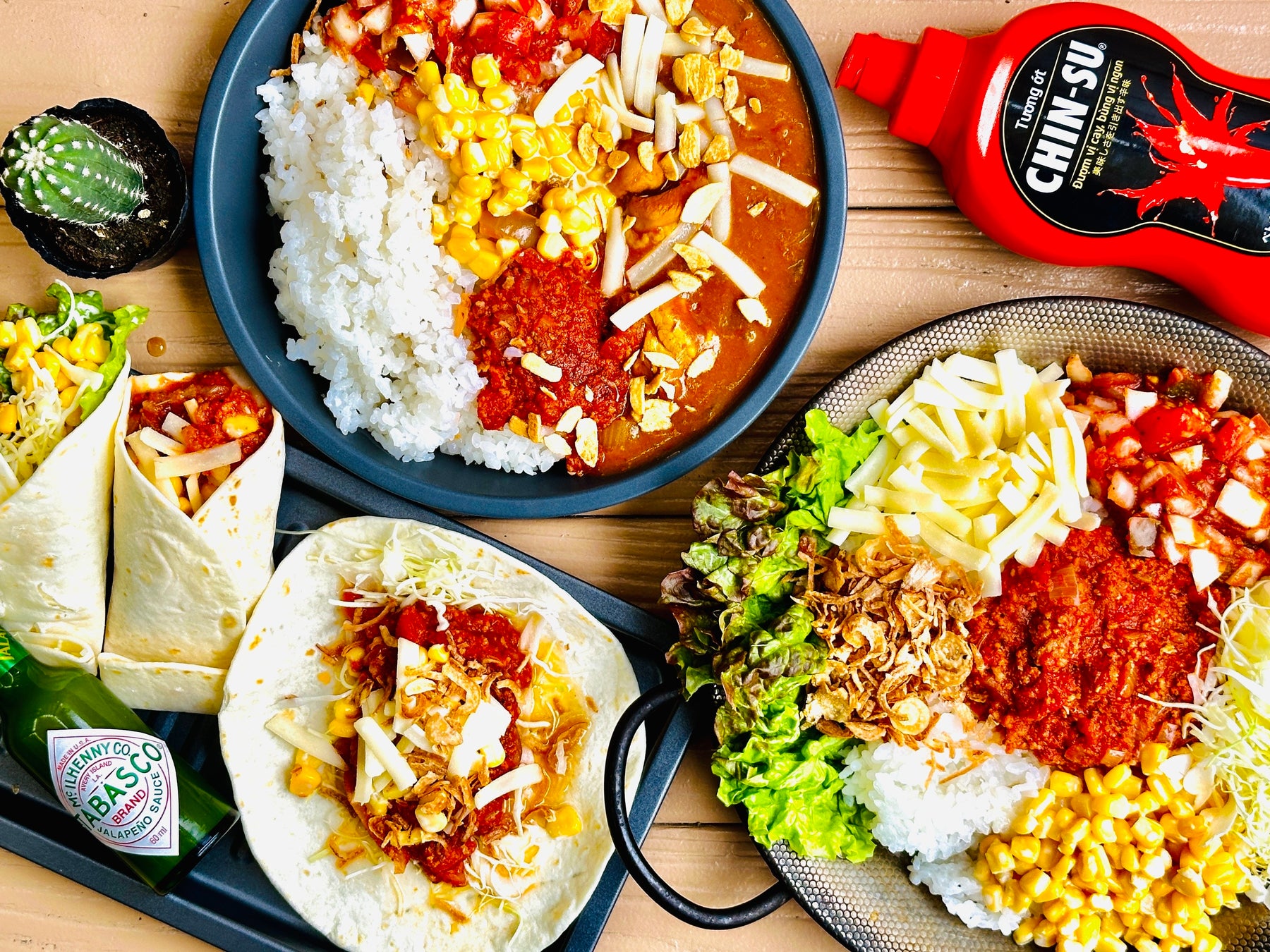 タコミートやカラフル野菜など15種類以上のお好きな具材やソースをトルティーヤで包んでTACOS PARTY!