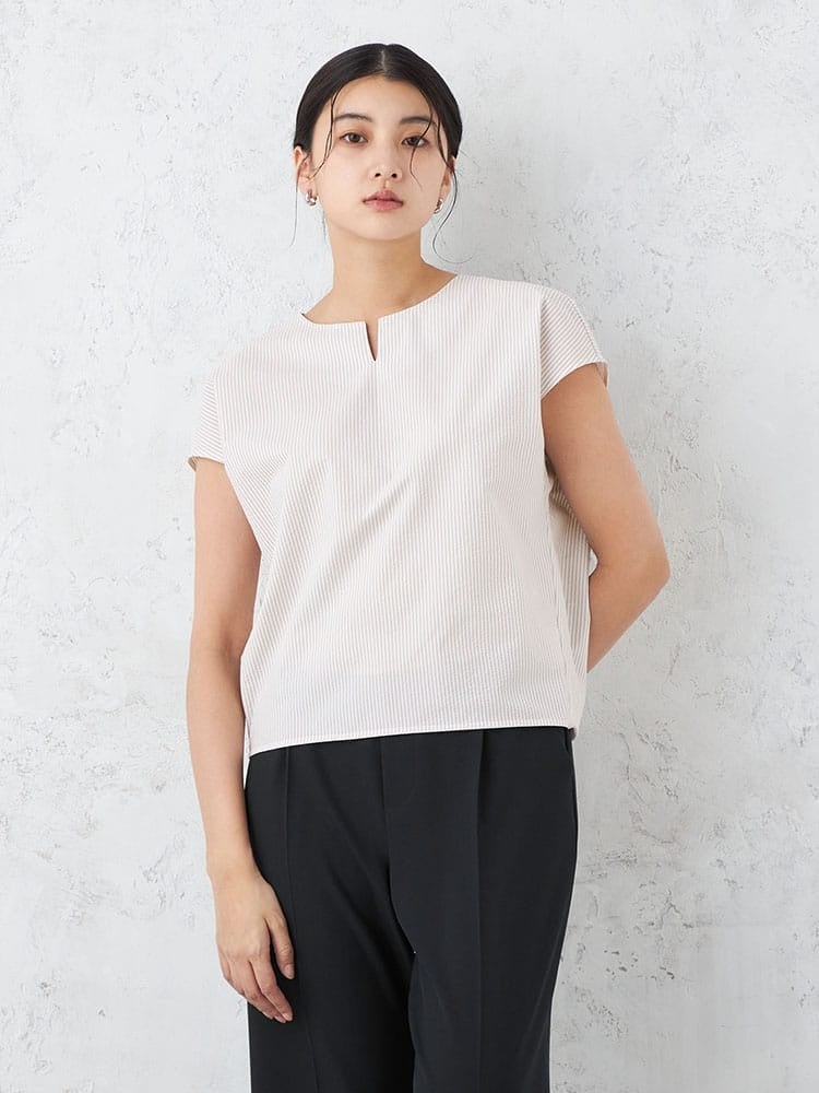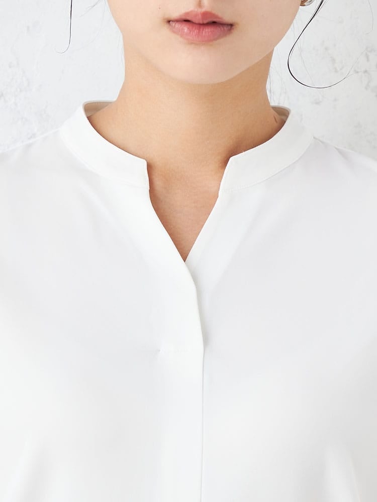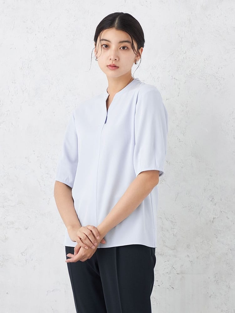 大人の上品さと快適性を追求「キーネック半袖ブラウス」