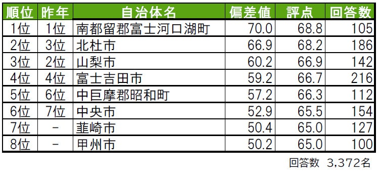 いい部屋ネット「街の幸福度 & 住み続けたい街ランキング2022<山梨県版>」発表