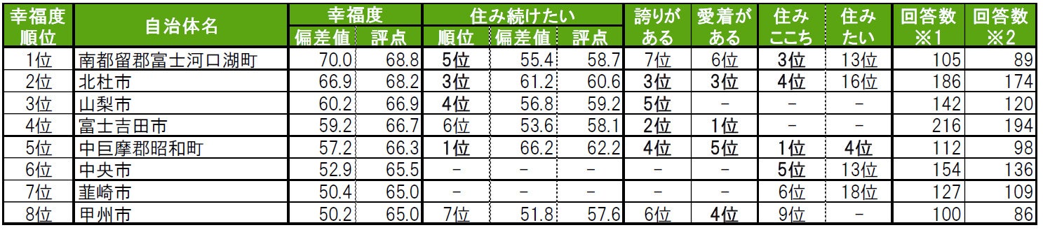 •「回答数※1」は、街の幸福度ランキングの設問に回答した2019年~2022年の4年間の累計回答数、「回答数※2」は、住み続けたい街・誇りがある街・愛着がある街ランキングの設問に回答した2020年~2022年の3年間の累計回答数です。