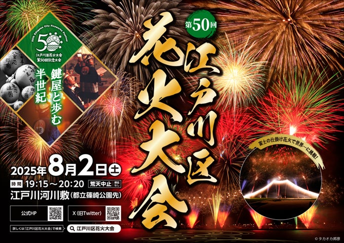 「かぎや~」のかけ声で知られる創業360年以上の歴史を持つ宗家花火「鍵屋」がお届けする、第50回江戸川区花火大会。この機会にぜひ、お越しください。