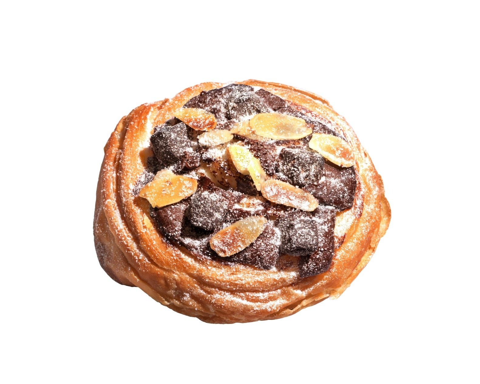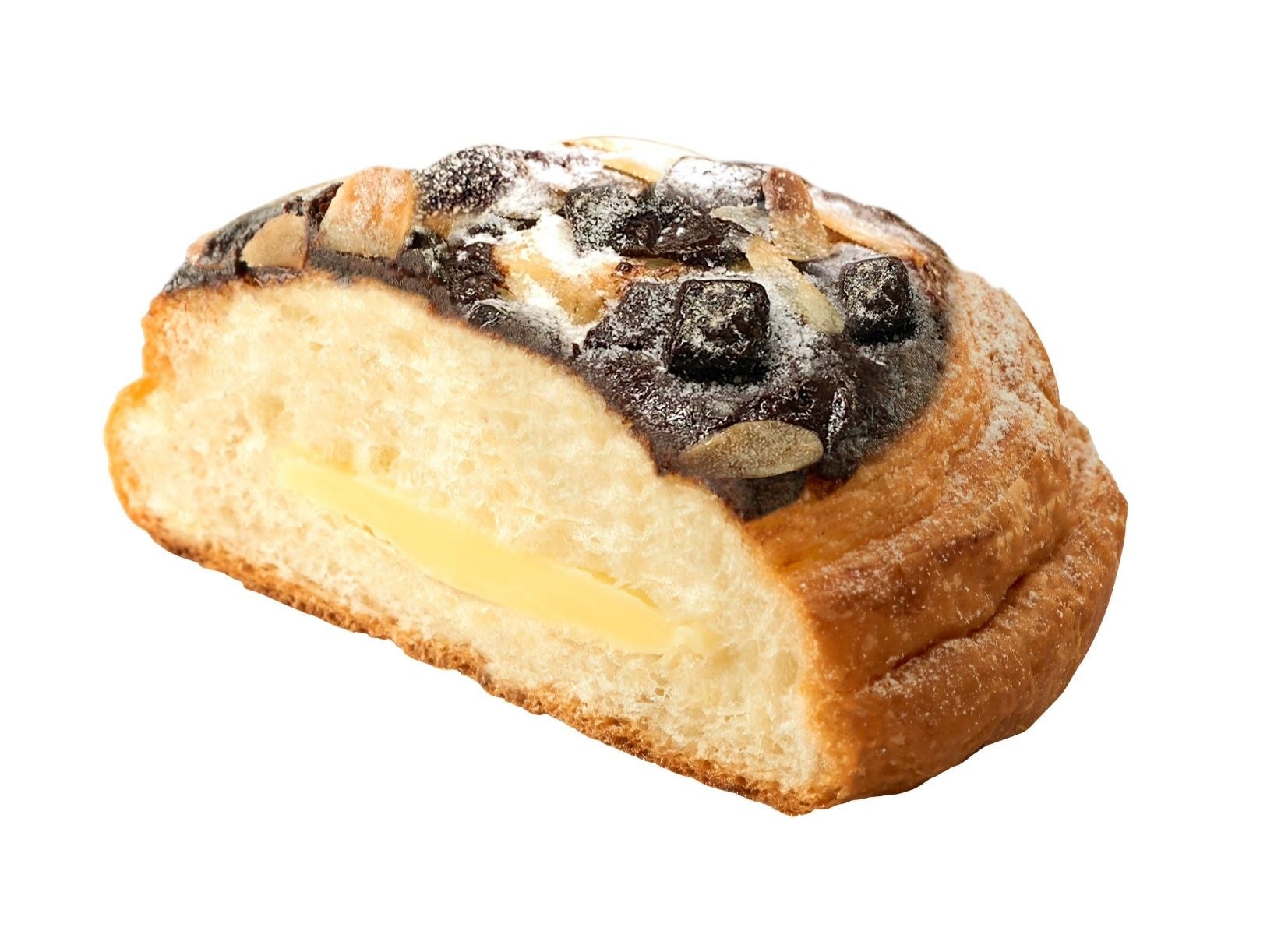 【内容】発酵バター入りの歯切れの良いデニッシュ生地に、チョコクリームを絞り、角切りのチョコとアーモンドをトッピングして焼き上げ、コクのある発酵バター入りクリームをサンドしています。ザクザクとした角切りの焼チョコの食感を楽しめます