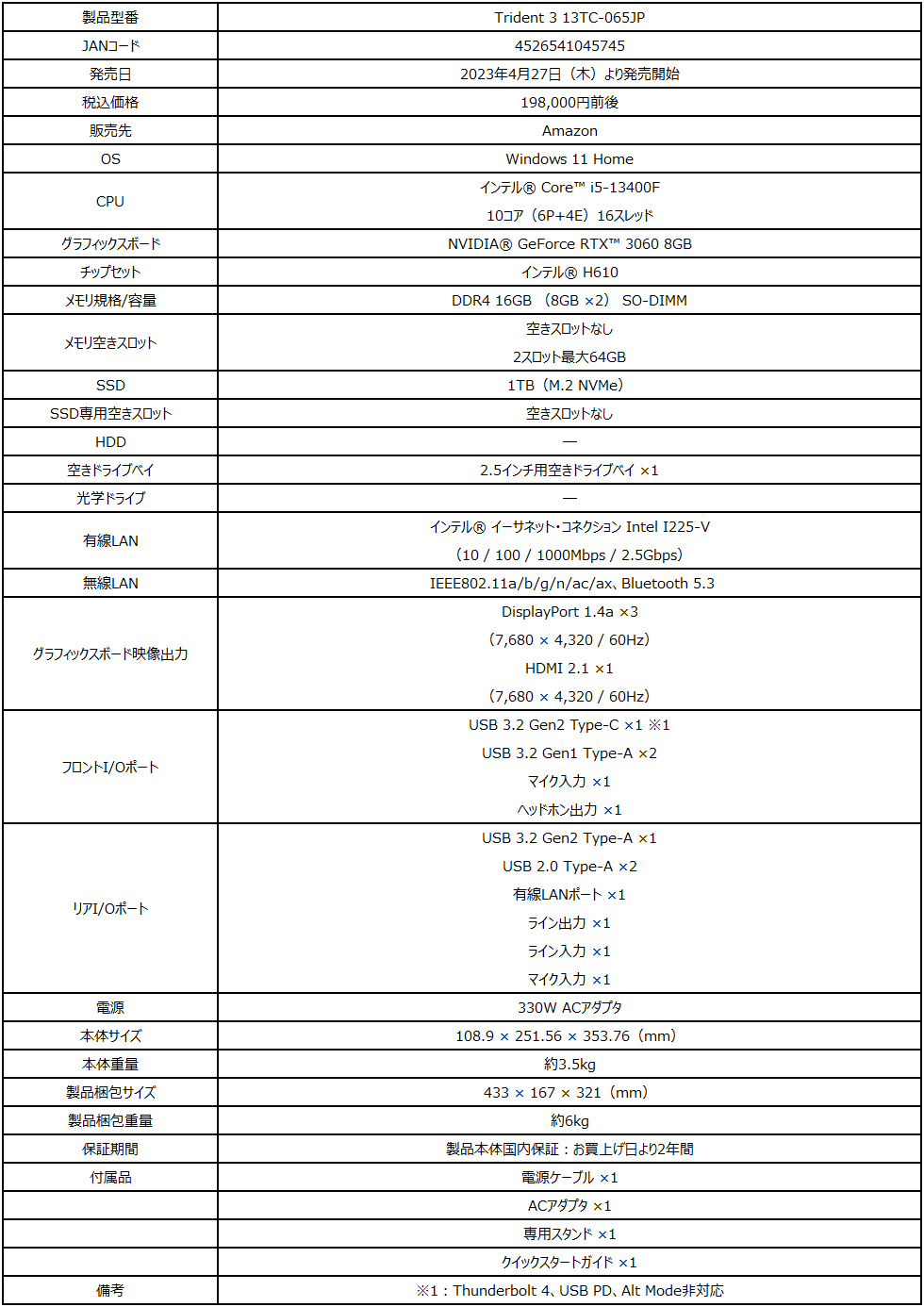 「Trident 3 13TC-065JP」は第13世代インテル® Core™ i5-13400F、最大4画面出力対応のNVIDIA® GeForce RTX™ 3060 8GBを搭載しており、RTXシリーズに搭載されているレイトレーシングやDLSSといった最新機能を手軽に体験することが可能で、フルHD対応のゲーミングモニターとの組み合わせで思う存分ゲームを楽しむ事が可能です。ゲームの快適性に重要なストレージには起動やロード時間を大幅に短縮可能なM.2 NVMeタイプのSSDを採用し、自社開発した高性能冷却ファンと熱源を分離したSilent Storm Coolingm 2により、高負荷時でも安定した動作が可能です。さらに、ネットワーク機能として2.5G LANポート、他の機器との干渉や混雑を避けて通信を行うことが可能なWi-Fi 6E機能で、設置場所を選ばずに快適なネットワーク環境をご利用いただけます。また、縦置きできる専用スタンドが付属しており、設置する部屋の雰囲気やスペースに合わせて縦横自由に設置方法をお選びいただけます。
