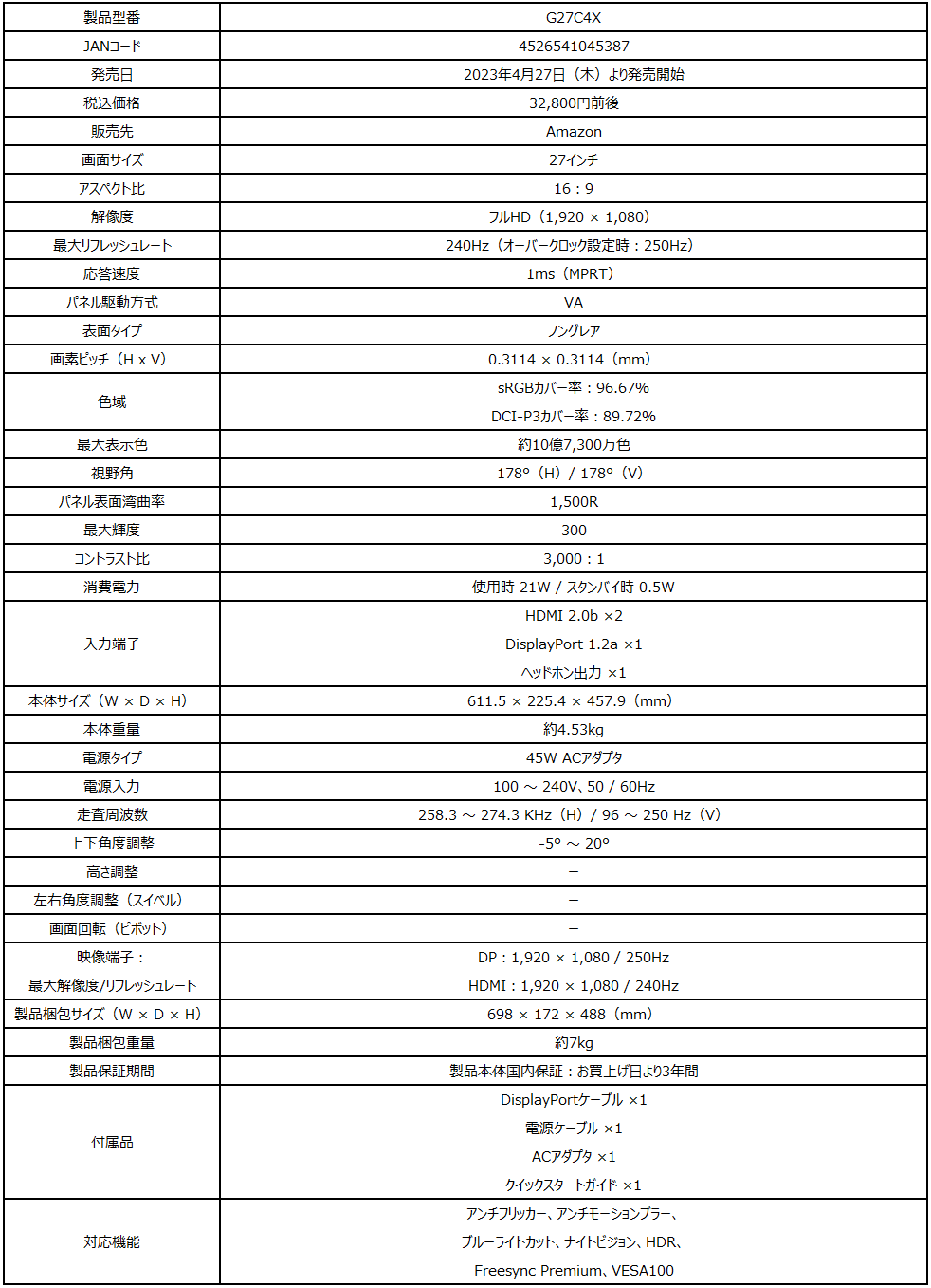 高い没入感を体験可能な湾曲パネル搭載27インチゲーミングモニター リフレッシュレート250Hz・応答速度1msのハイスペックモデル 「G27C4X」発売