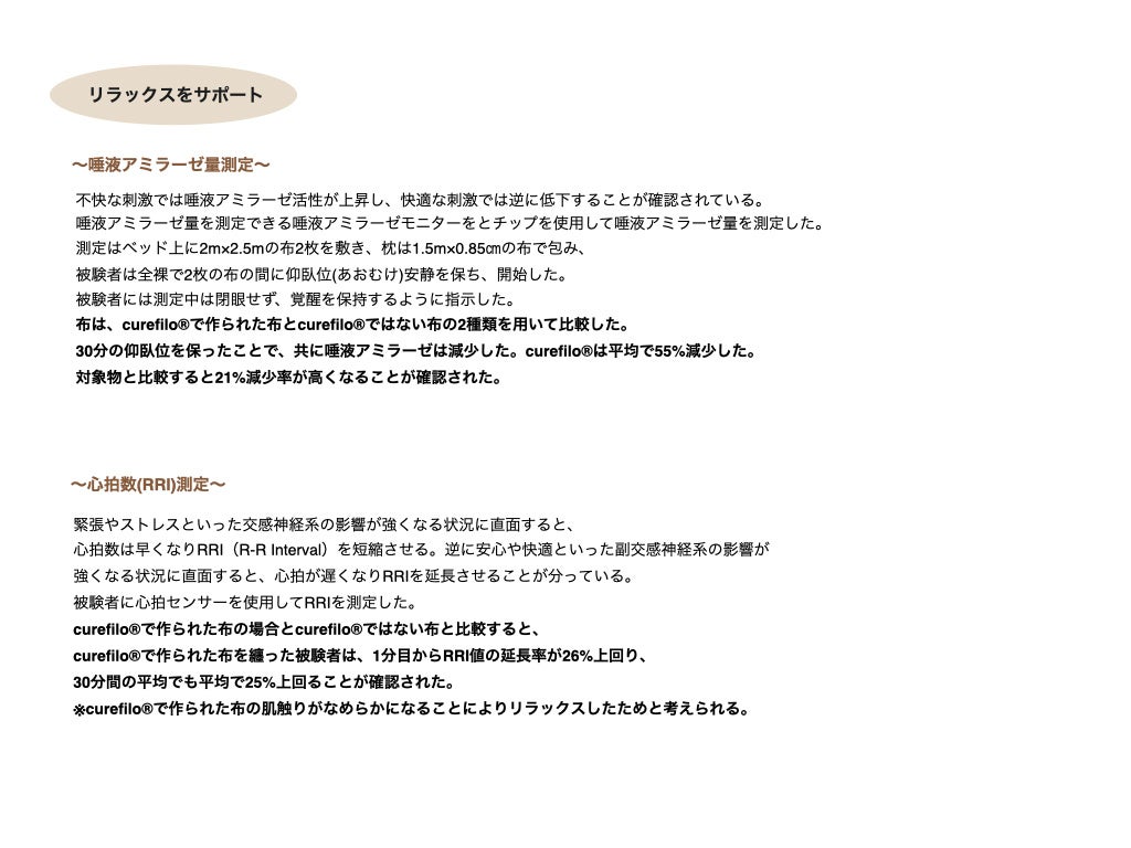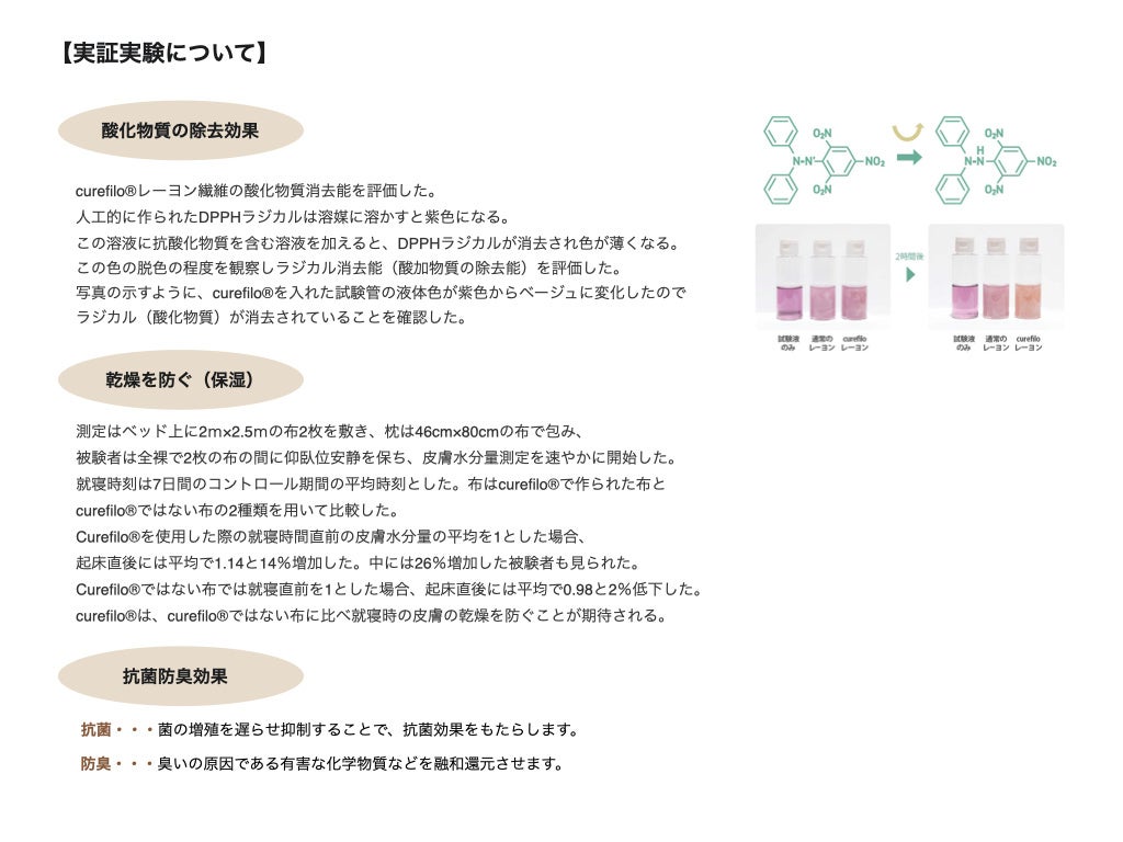 さらに、素材の検証では、curefiloを使用した布を用いた比較試験において、就寝後の皮膚水分量の増加などが確認されており、乾燥を抑える環境づくりへの寄与が示唆されています。