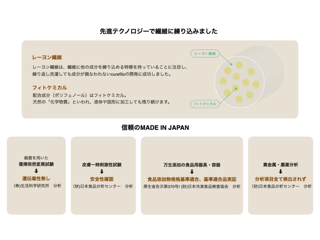 本プロジェクトでは、天然植物由来成分を繊維に練り込んだ機能性素材「curefilo(キュアフィーロ)」 を採用しています。