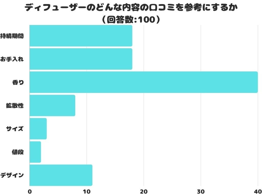 ディフューザーのどんな内容の口コミを参考にするかをアンケートにて調査したところ、1位は「香り」でした。