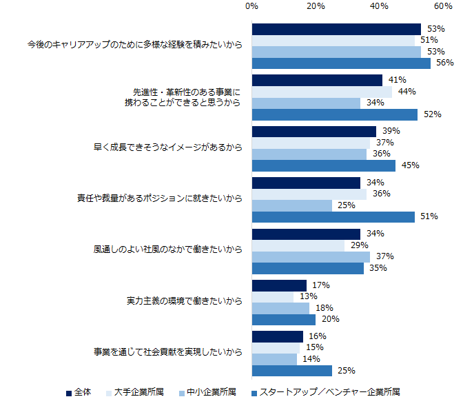 ★ スタートアップに転職したい理由、第1位は「今後のキャリアアップのために多様な経験を積みたいから」。転職したくない理由の第1位は「企業の将来性が不安」。