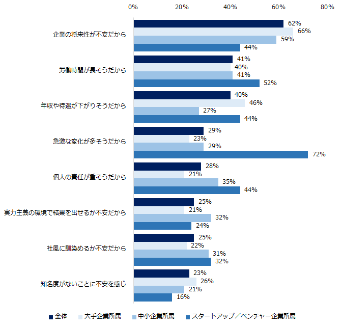 一方、スタートアップ企業について「検討はするが、どちらかといえば転職したくない」「転職したくない」と回答した方の理由トップは「企業の将来性が不安だから」(62%)でした。こちらは所属企業別で大きく差が出る結果に。大手・中小企業所属の方は全体と大きな違いはありませんでしたが、スタートアップ/ベンチャー企業所属の方の理由トップは「急激な変化が多そうだから」(72%)でした。