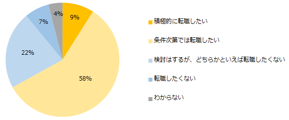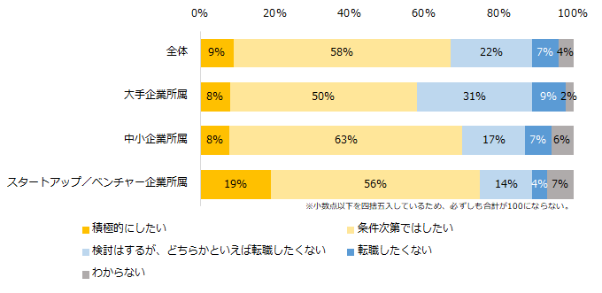 34歳以下の方に、スタートアップ企業への転職についてどう思うか伺うと、67%が「転職したい」(積極的に転職したい:9%、条件次第では転職したい:58%)と回答しました。所属企業規模別で見ると、現在スタートアップ/ベンチャー企業に所属している方のほうが、スタートアップ企業への転職について前向きなことが分かります。