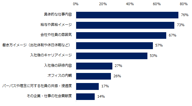 34歳以下の方に、自分に合う企業を判断する際、参考になると思うものを伺うと、上位は「口コミサイト」(71%)、「企業の採用HPやコーポレートサイト」(64%)でした。続いて、参考にしている媒体を通して詳細を知れると嬉しいことを伺うと、トップ3は「具体的な仕事内容」(76%)、給与や昇給イメージ(73%)、会社や社員の雰囲気(67%)でした。